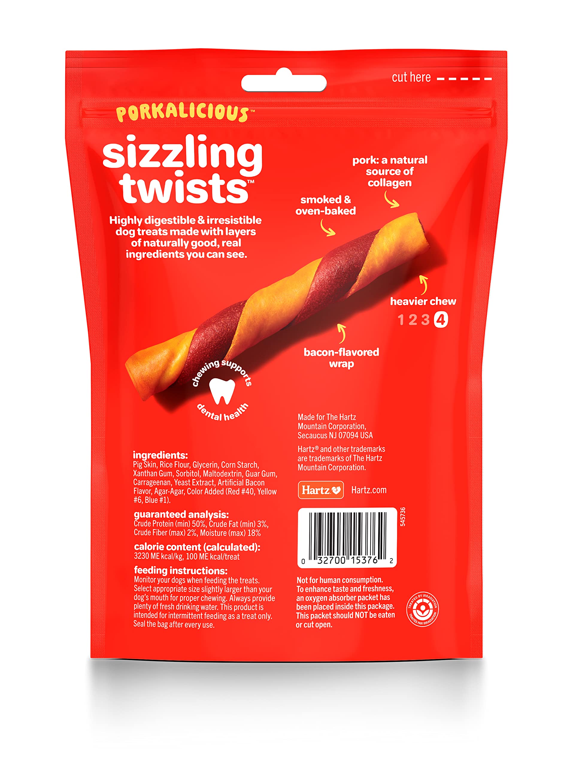 Hartz Oinkies Porkalicious Sizzling Twists are highly digestible and irresistible dog treats made with layers of naturally good, real ingredients you can see. Without any beef rawhide, these Oinkies dog treats are made with real pigskin and have a bacon-flavor wrap so they are full of flavor! These dog chew treats are smoked and oven-baked to lock in that delicious flavor your dog will go crazy for! Oinkies Sizzling Twists are considered a heavier chew.