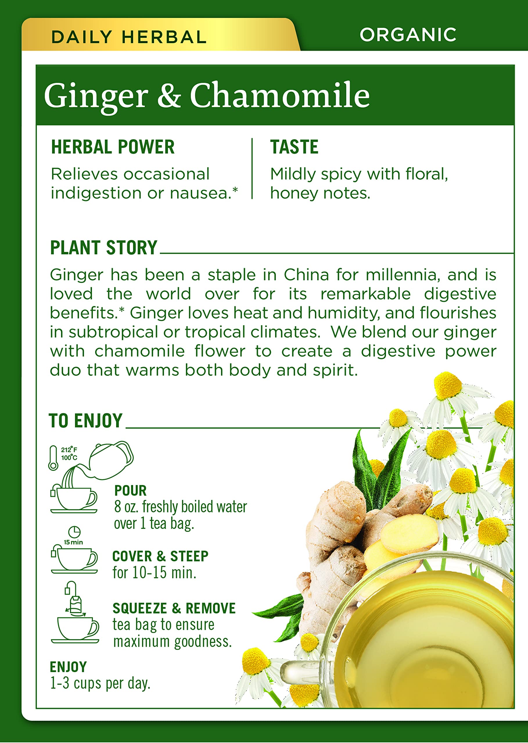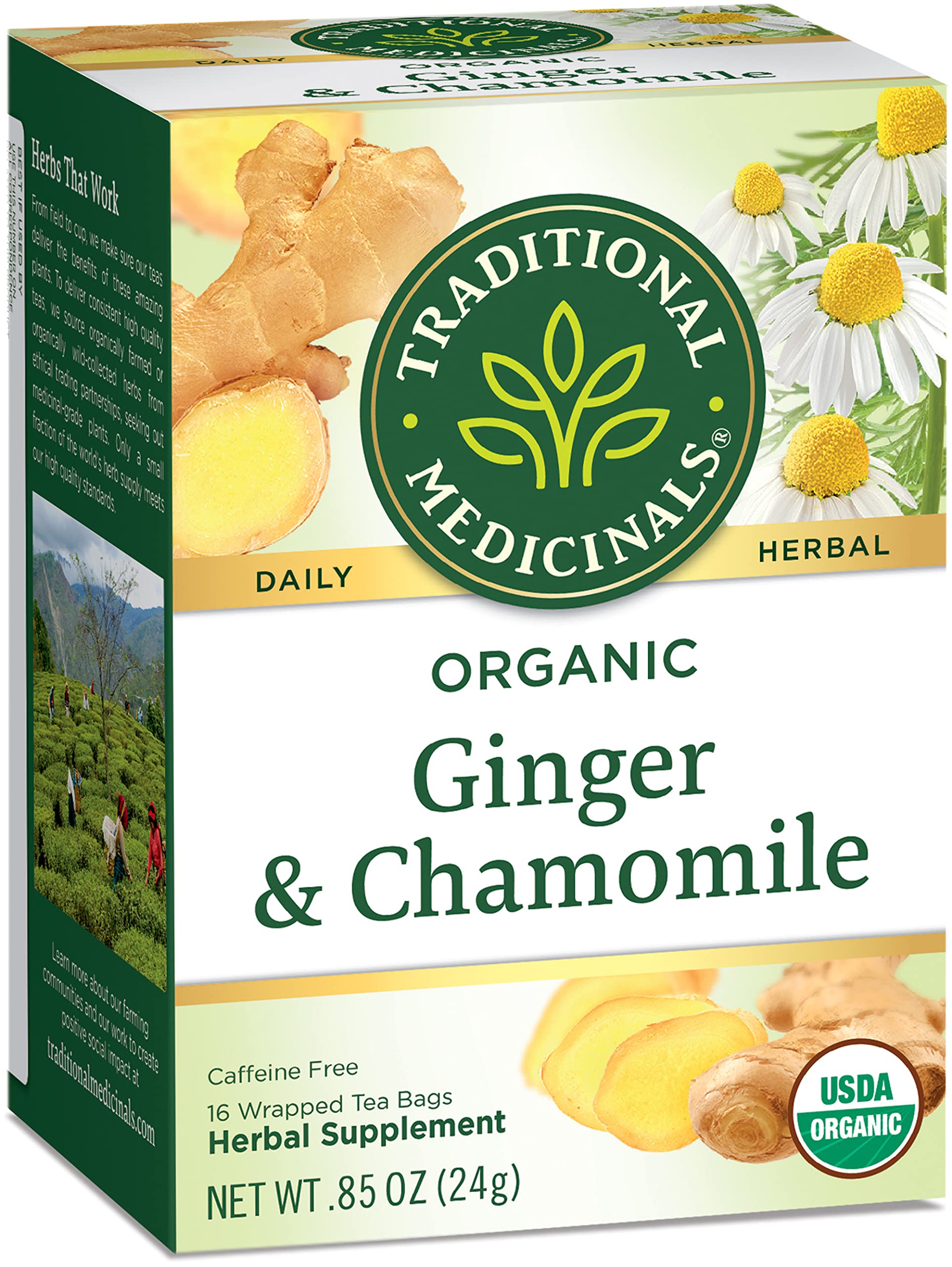 Traditional Medicinals Organic Ginger & Chamomile Herbal Tea, Relieves Occasional Indigestion or Nausea, (Pack of 1) - 16 Tea Bags