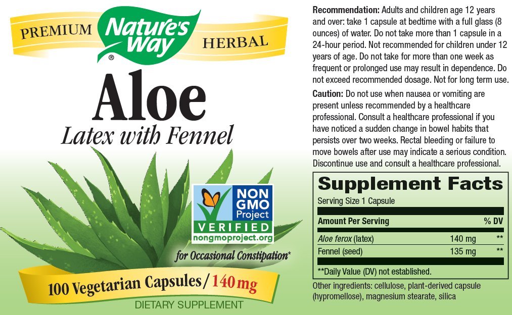 Nature's Way Aloe Latex with Fennel 140 mg, for Occasional Constipation, 100 Vegan Capsules, Pack of 2