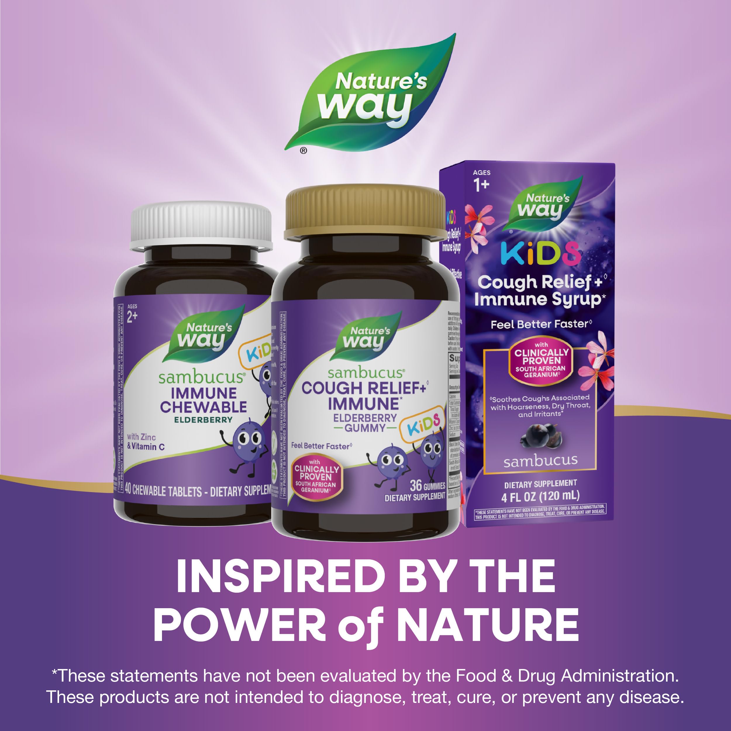 Nature’s Way Sambucus Kids Cough Relief +(1) Immune Gummy*, Feel Better Faster(1), Clinically Proven South African Geranium, with Elderberry, Vitamin C & Zinc, Gluten Free, Vegetarian, 36 Gummies