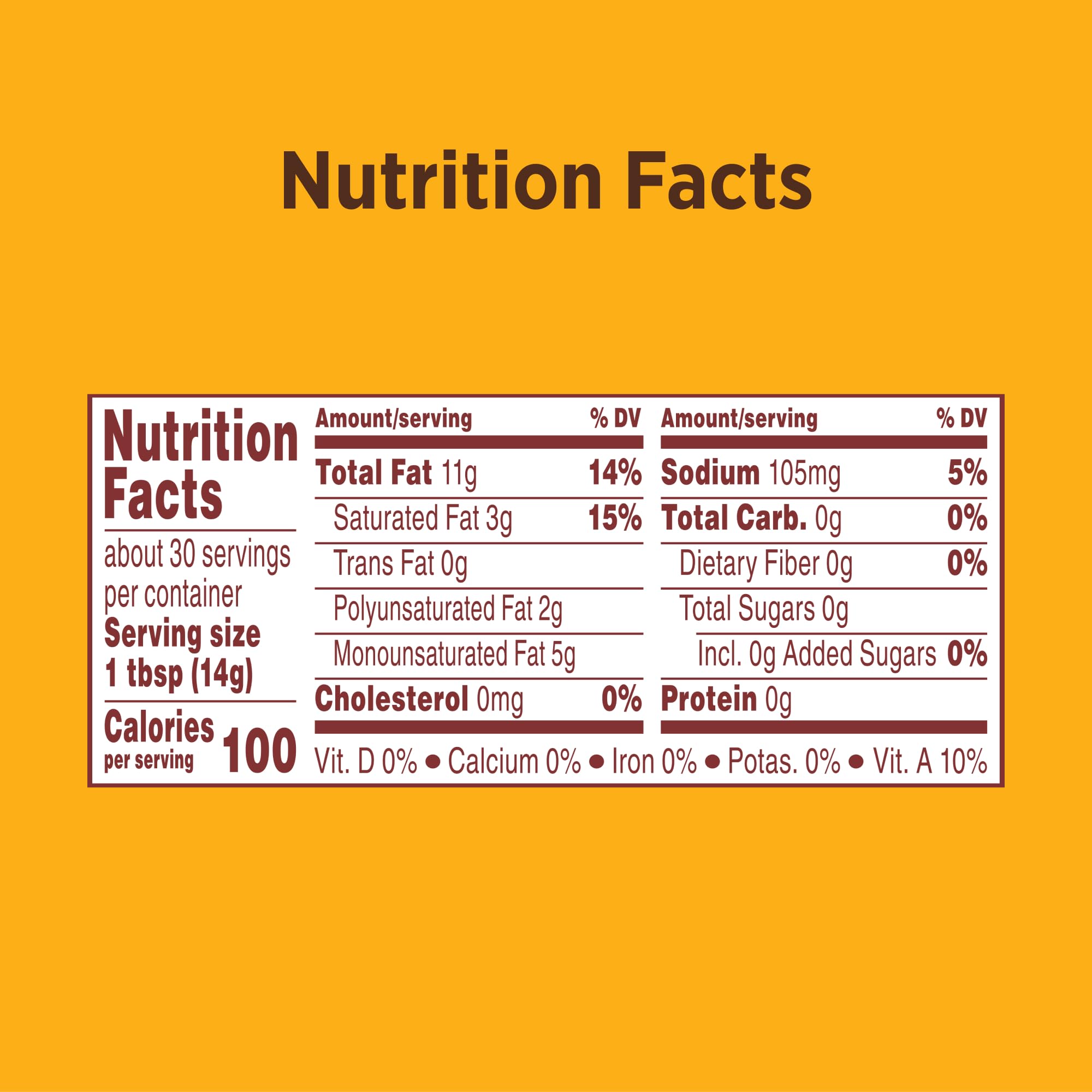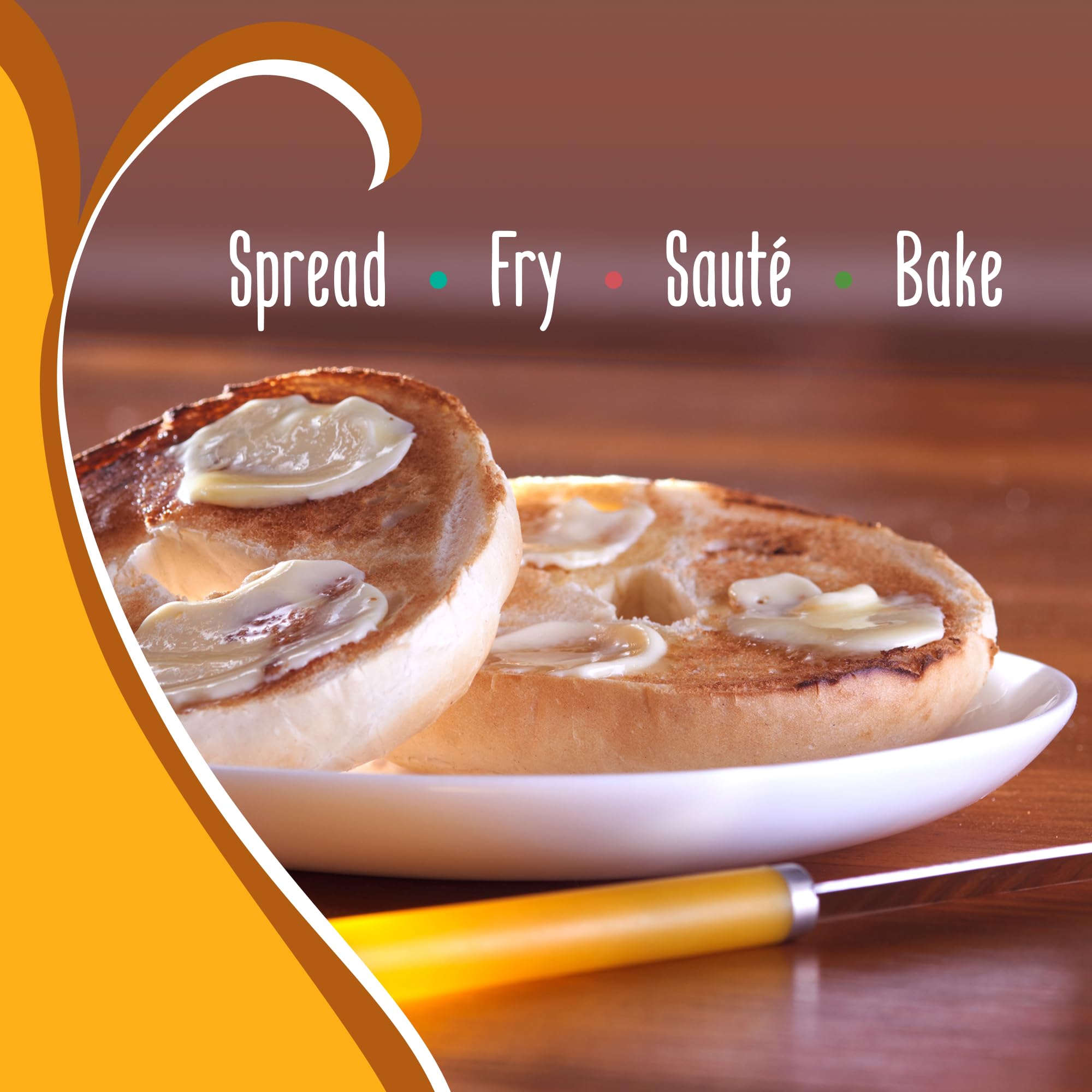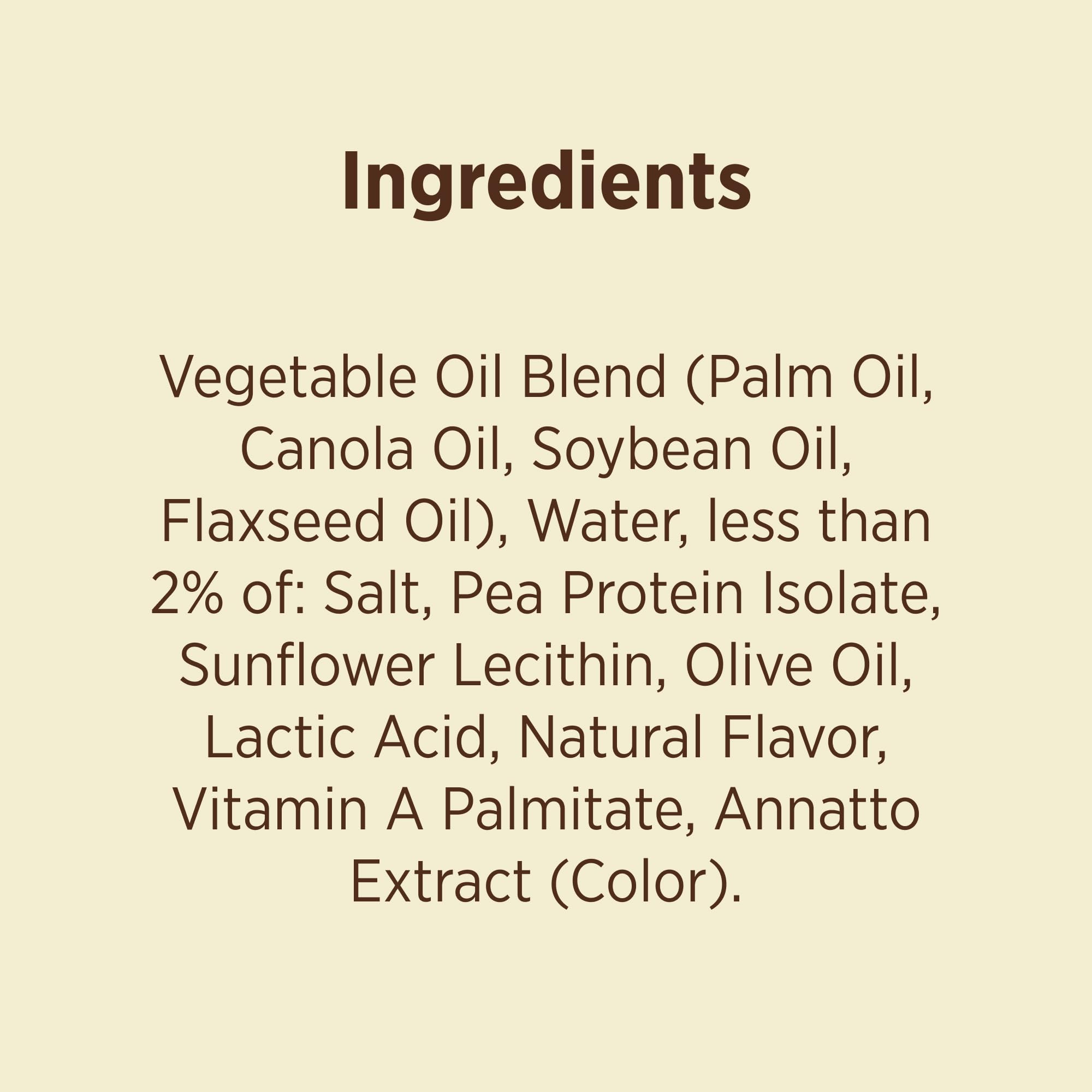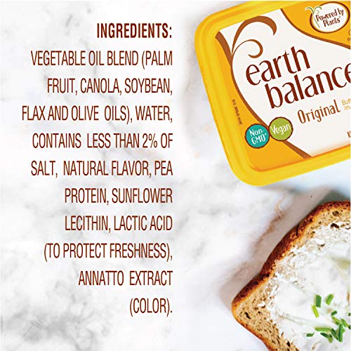 Earth Balance Plant Butter Original Plant Based Oil Spread is a delicious butter alternative that offers all the rich taste you crave in a non-dairy spread. This 77% plant-based oil spread is perfect for spreading, frying, sautéing, and baking. It contains 0mg of cholesterol per serving, is an excellent source of Omega-3 ALA with 400mg per serving, which provides 25% of the Daily Value for ALA1, and includes Vitamin A. Free from hydrogenated oils, this vegan spread is also gluten free, lactose free, and contains no MSG. Whether you’re spreading it on toast or hot muffins, using it to sauté vegetables, or incorporating it into your baking recipes, this plant butter will delight your taste buds and win your heart. Its variety of uses and great rich taste make it an ideal butter alternative and kitchen essential. Earth Balance believes that plant-based eating is a delicious way to enjoy food while respecting the planet, which is why this spread is Non-GMO Project Verified, Certified Vegan, and made with Certified Sustainable Palm Oil. This butter substitute is plant-based diet friendly and comes in a convenient, 15-ounce refrigerated tub. 1See nutrition information for fat and saturated fat.