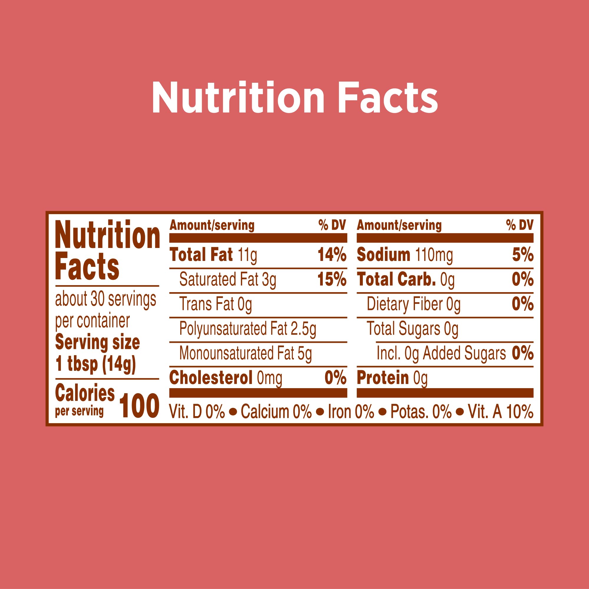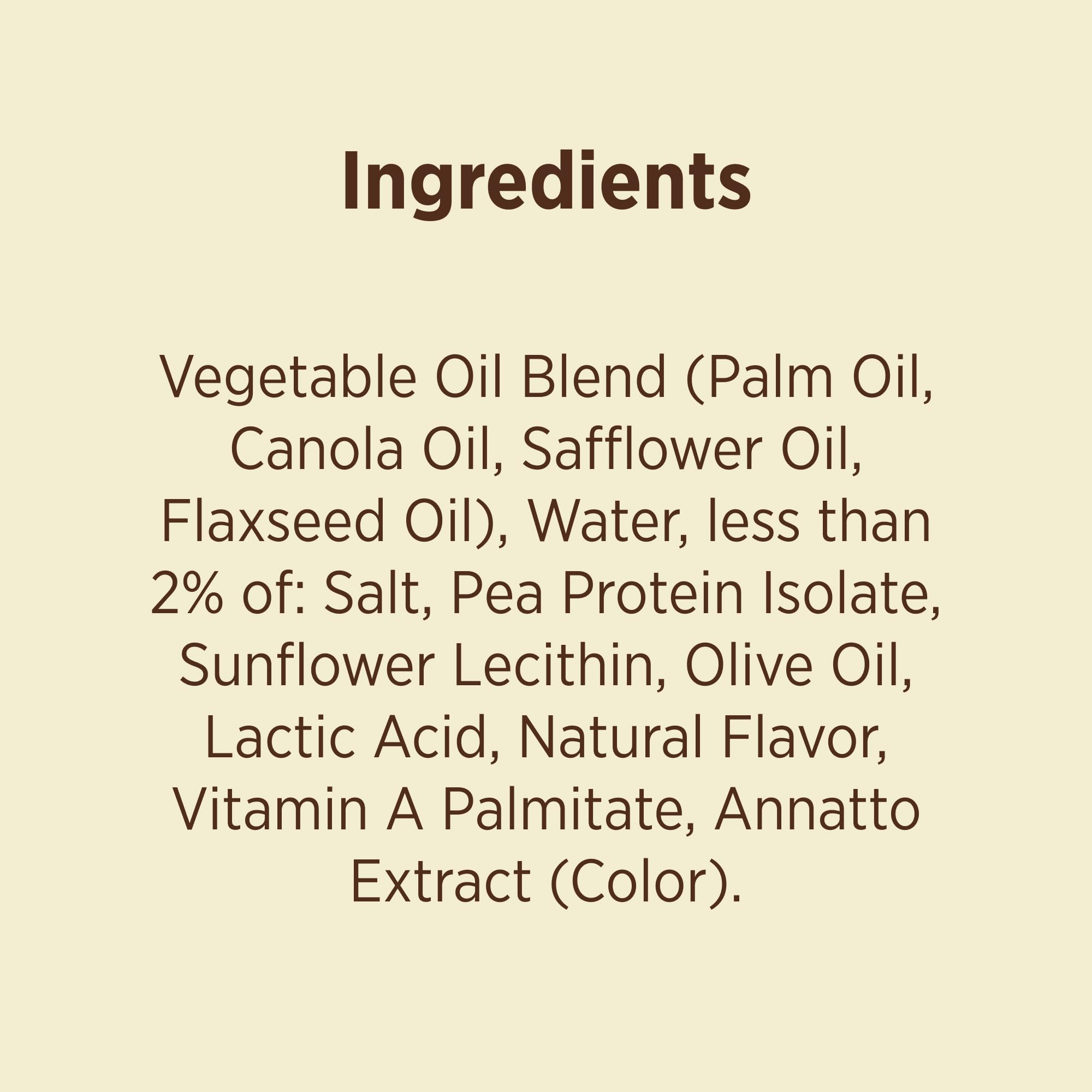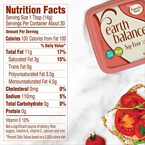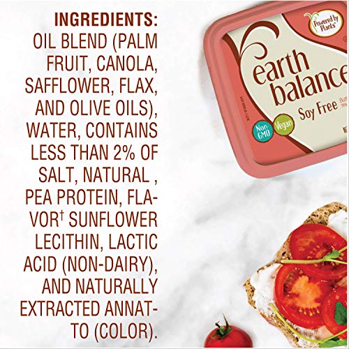 Earth Balance Plant Butter Soy Free Plant Based Oil Spread is a delicious butter alternative that offers all the rich taste you crave in a non-dairy spread. This 78% plant-based oil spread is perfect for spreading, frying, sautéing, and baking. It contains 0mg of cholesterol per serving, is an excellent source of Omega-3 ALA with 500mg per serving, which provides 31% of the Daily Value for ALA1, and includes Vitamin A. Free from hydrogenated oils, this vegan spread is also gluten free, lactose free, and contains no MSG. Whether you’re spreading it on toast or hot muffins, using it to sauté vegetables, or incorporating it into your baking recipes, this plant butter will delight your taste buds and win your heart. Its variety of uses and great rich taste make it an ideal butter alternative and kitchen essential. Earth Balance believes that plant-based eating is a delicious way to enjoy food while respecting the planet, which is why this spread is Non-GMO Project Verified, Certified Vegan, and made with Certified Sustainable Palm Oil. This soy-free butter substitute is plant-based diet friendly and comes in a convenient, 15-ounce refrigerated tub. 1See nutrition information for fat and saturated fat.