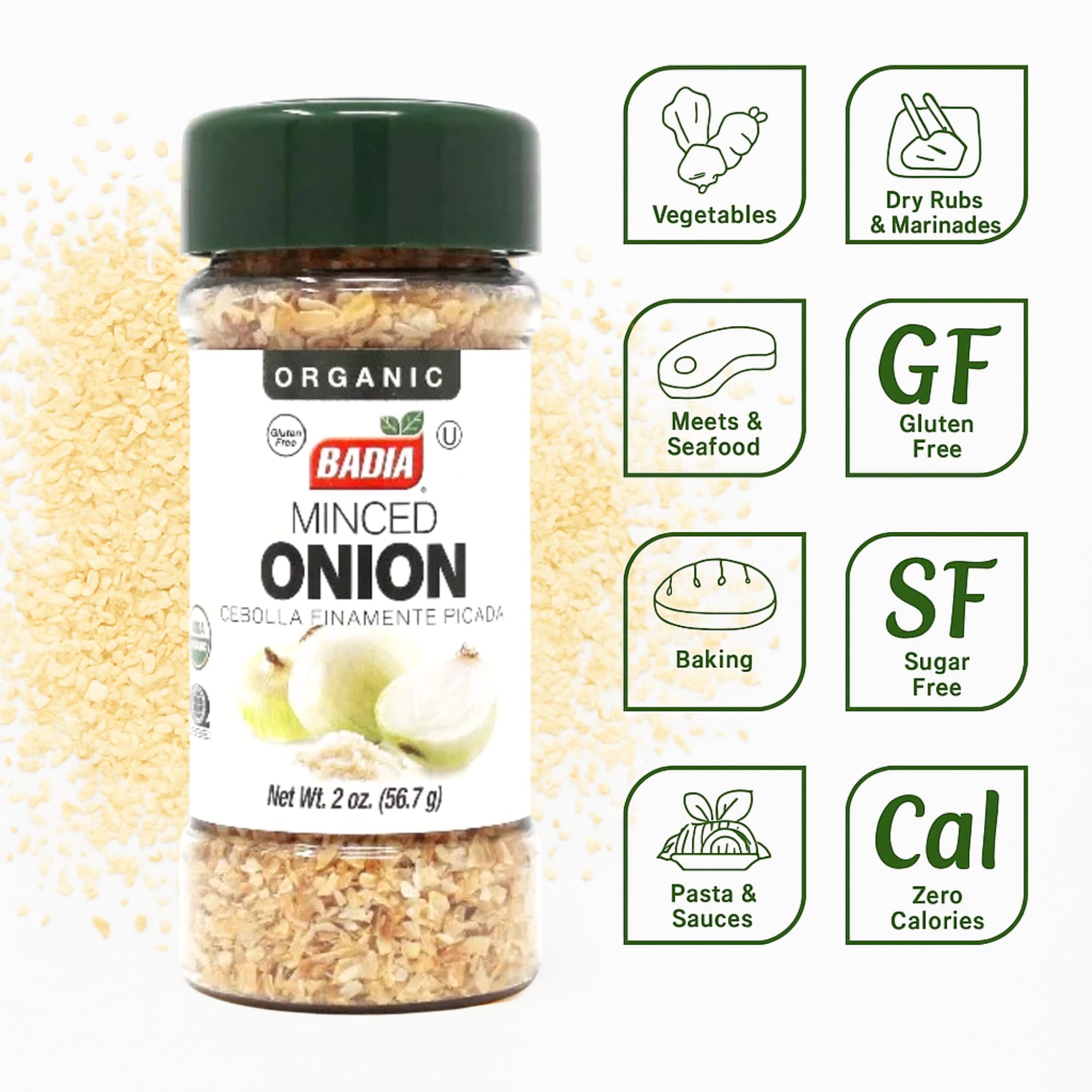 Badia Organic Minced Onion, 2 oz – Dehydrated Onion Flakes for Cooking & Seasoning – Rich, Savory Flavor