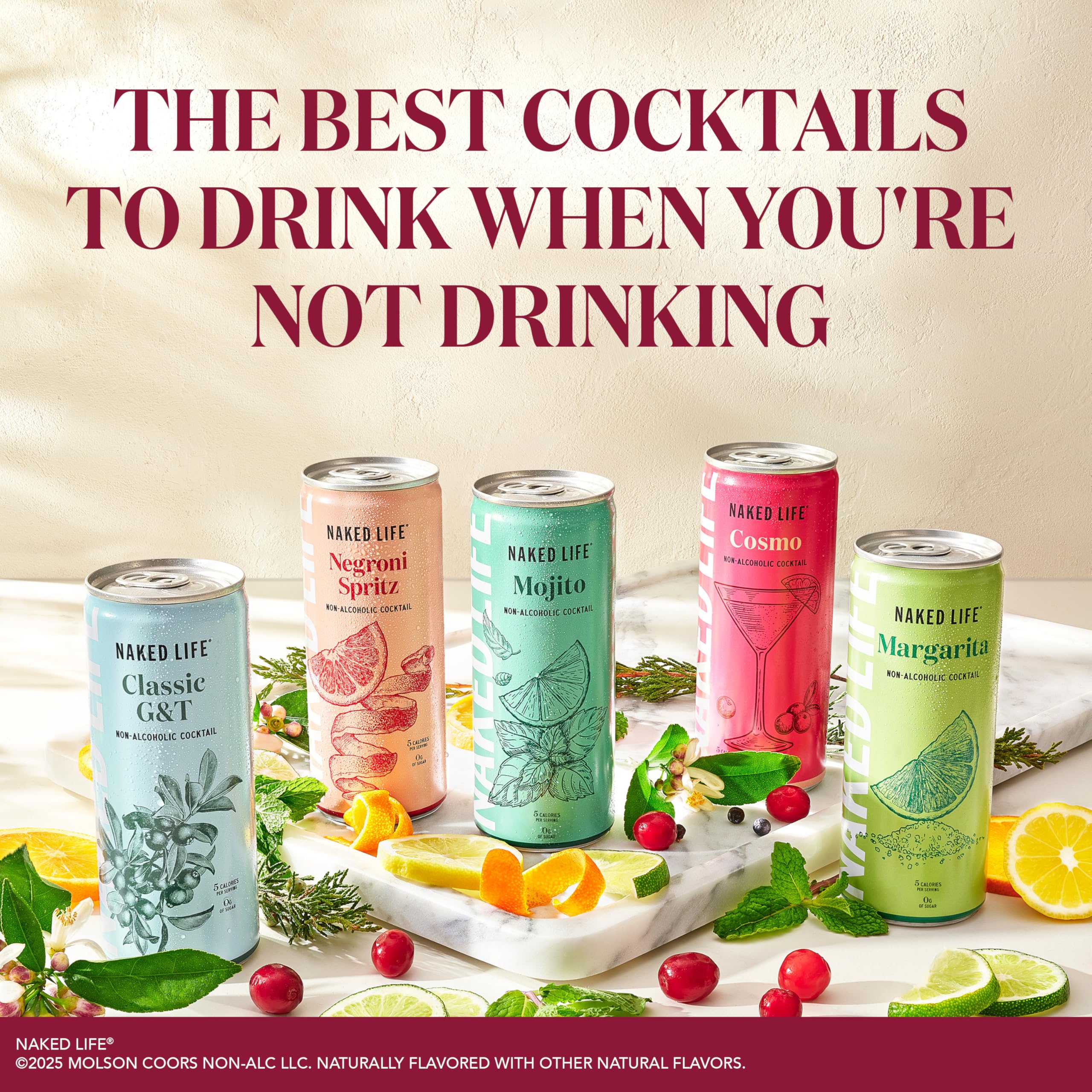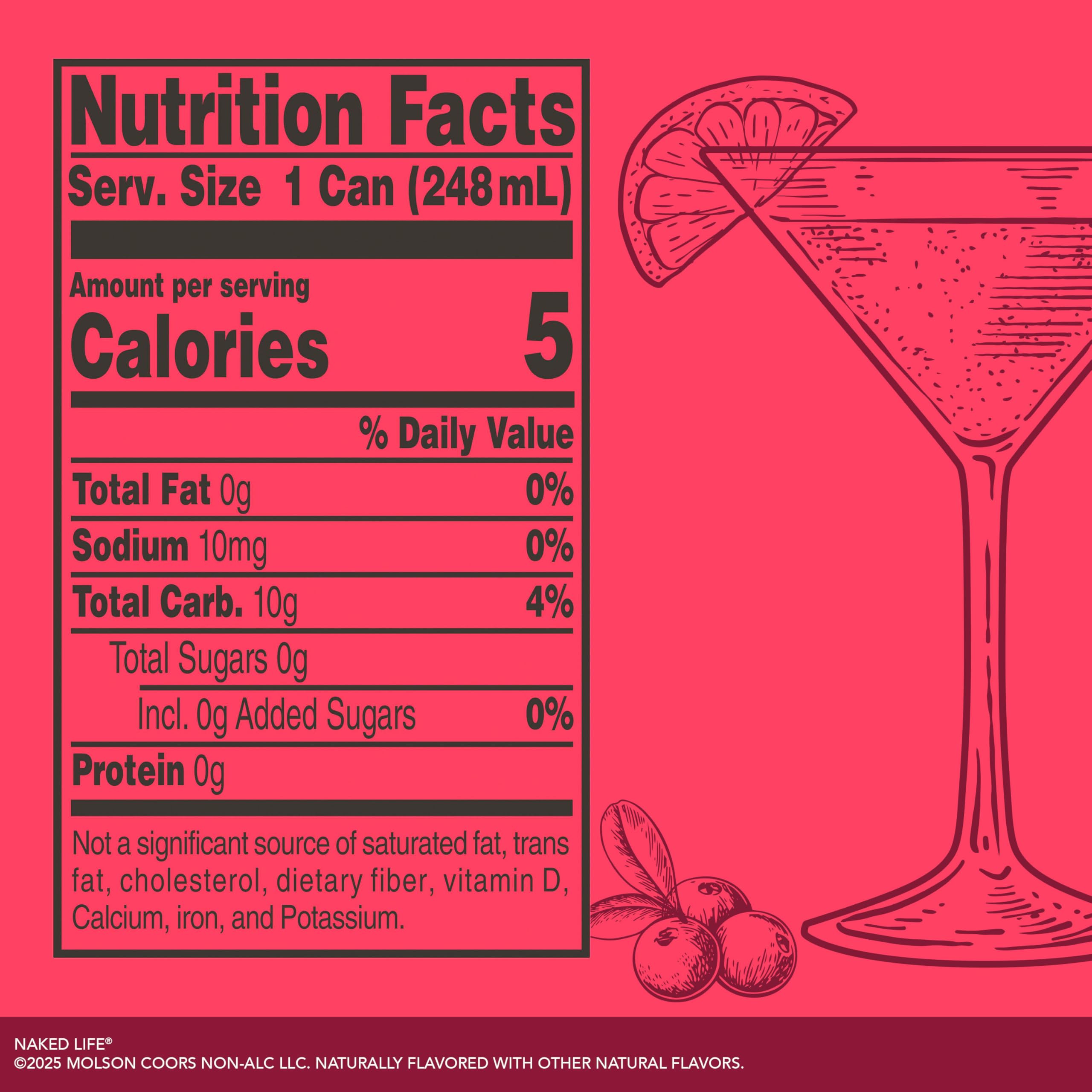 Crafted to create exceptional drinking experiences, Naked Life Cosmo Non-Alcoholic Cocktails provide a true-to-cocktail taste with zero sugar and 5 calories so you can sip the cocktails you love, your way. Our sparkling Cosmopolitan takes you straight to the rooftop bars of Manhattan. Refreshing cranberry and lime flavors are top noted with subtle orange notes. Serve over ice, with a small twist of orange, or not, it's your choice. For the best cocktails to drink when you're not drinking, try a 4 pack of 8.4 fl oz cans of non-alcoholic Cosmo cocktails. Naked Life is not the first of its kind, just the tastiest!