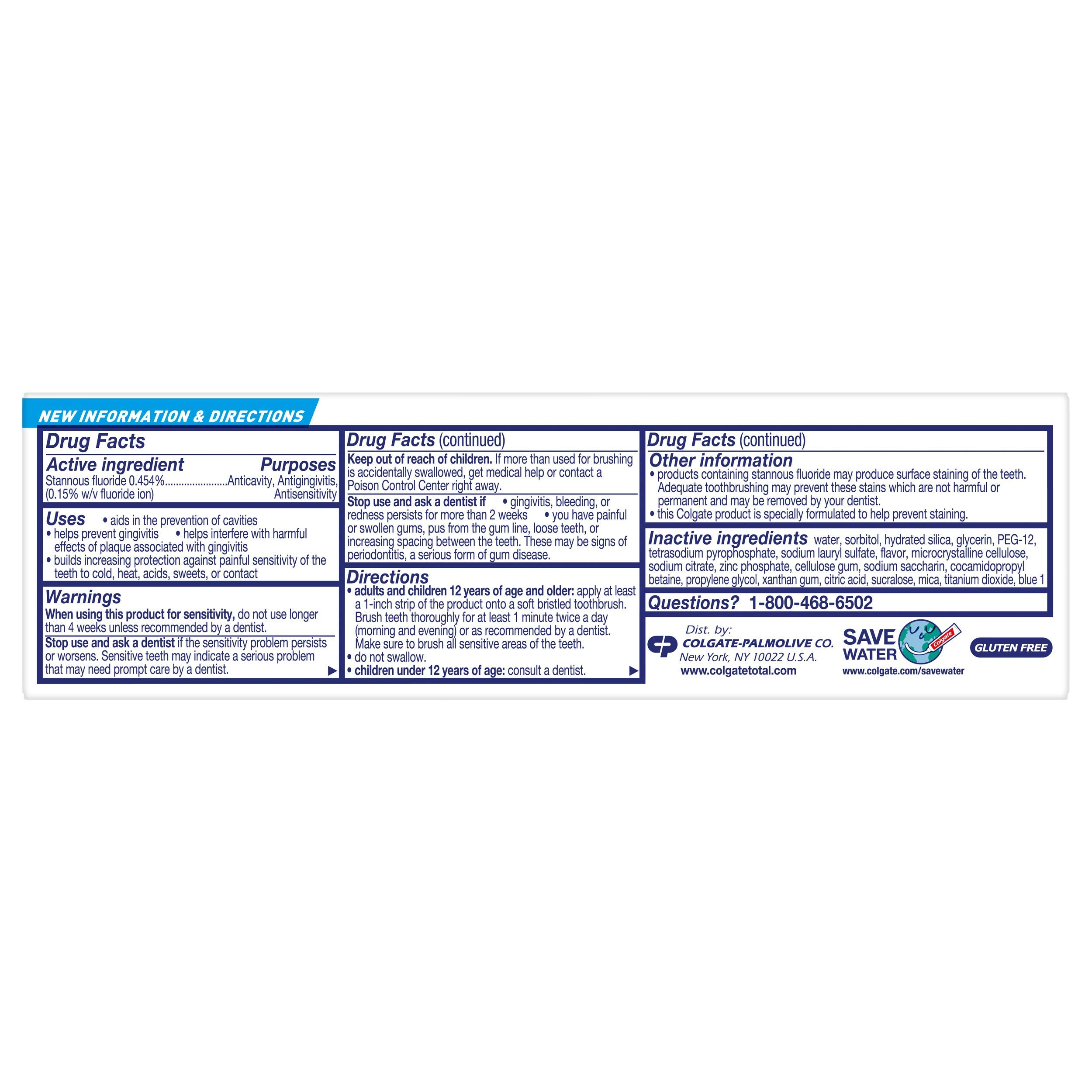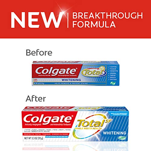 Colgate Total SF Whitening Gel Toothpaste has a breakthrough formula that fights bacteria on teeth, tongue, cheeks and gums for Whole Mouth Health. Colgate Total with stannous fluoride also offers more benefits than ever including sensitivity relief, improved enamel strength* and odor neutralization* (*based on in vitro studies)