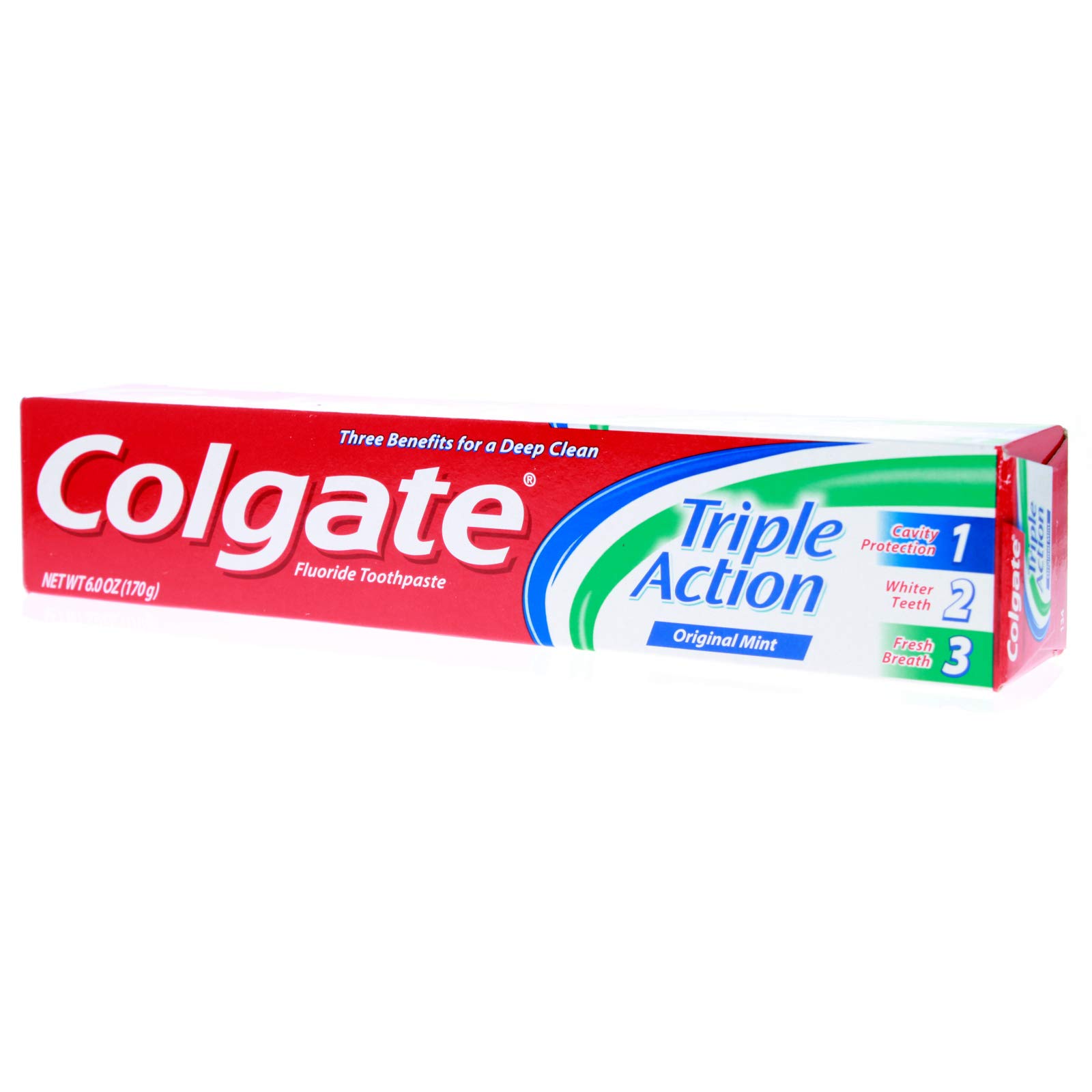 Colgate Triple Action Flouride Toothpaste Original Mint, With a great original mint flavor, provides three benefits with regular brushing for a deep clean. Cavity protection, helps strengthen your teeth. Whiter teeth, helps remove surface stains. Fresh breath, helps fight against bad breath.