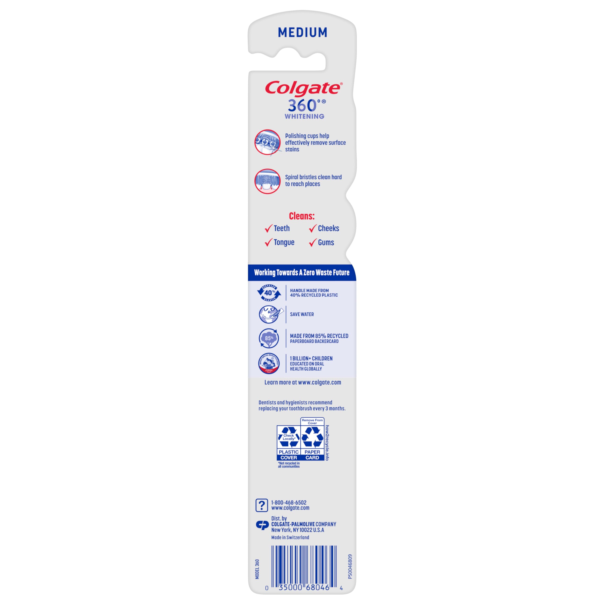 The Colgate 36⁰ Optic White medium manual whitening toothbrush is designed with whitening cups that hold toothpaste to effectively help remove surface stains for a naturally white smile. It also features polishing spiral bristles, a cheek & tongue cleaner, and an ergonomic handle design.