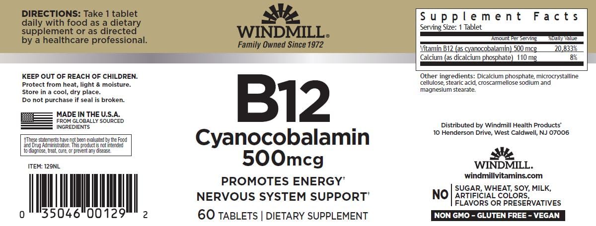 Windmill Vitamin B-12 500 mcg Tablets provide a convenient source of this essential nutrient for daily support. Designed for consistent use, these easy-to-take tablets help maintain a well-balanced routine. The 60-count bottle ensures a steady supply, making it a practical choice for regular supplementation.