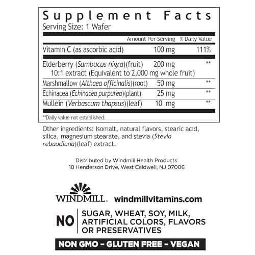 chewable formula provides 200 mg of elderberry to prepare for the Cold Season. Formulated with herbs such as elderberry, echinacea, mullein and vitamin C an antioxidant for symptom relief and immune support .A tasty way to enjoy the benefits and boost a healthy immune system!FREE OF: SUGAR, YEAST, WHEAT, MILK, SOY, ARTIFICIAL COLORS OR PRESERVATIVESSUGGESTED USE: Take 1 chewable wafer daily or as a dietary supplement directed by a healthcare professional.