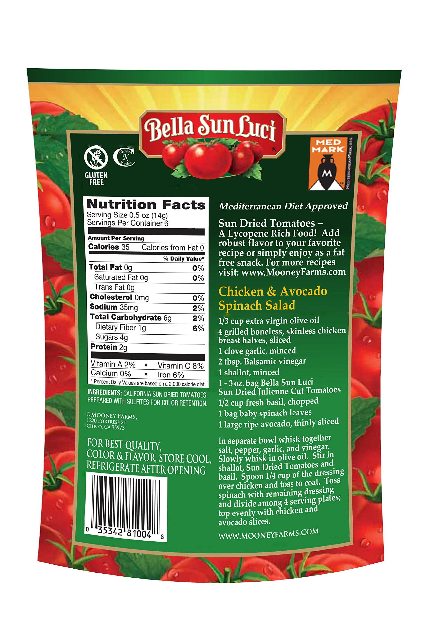 Bella Sun Luci Sun Dried Tomatoes Julienne-Cut are the new tradition of healthy eating! We use premium ingredients from the bounty of California including premium California tomatoes ripened in the sun, and authentic seasonings to create healthy Mediterranean inspired products. All conveniently packed in a resealable pouch! Bella Sun Luci Sun Dried Tomato Julienne-Cut are Medmark/Mediterranean diet approved, Kosher, vegan, and Non GMO. Enjoy a true Italian kitchen staple made smaller; perfect for pasta, pizza, sandwiches, salads, charcuterie, appetizers, and more!