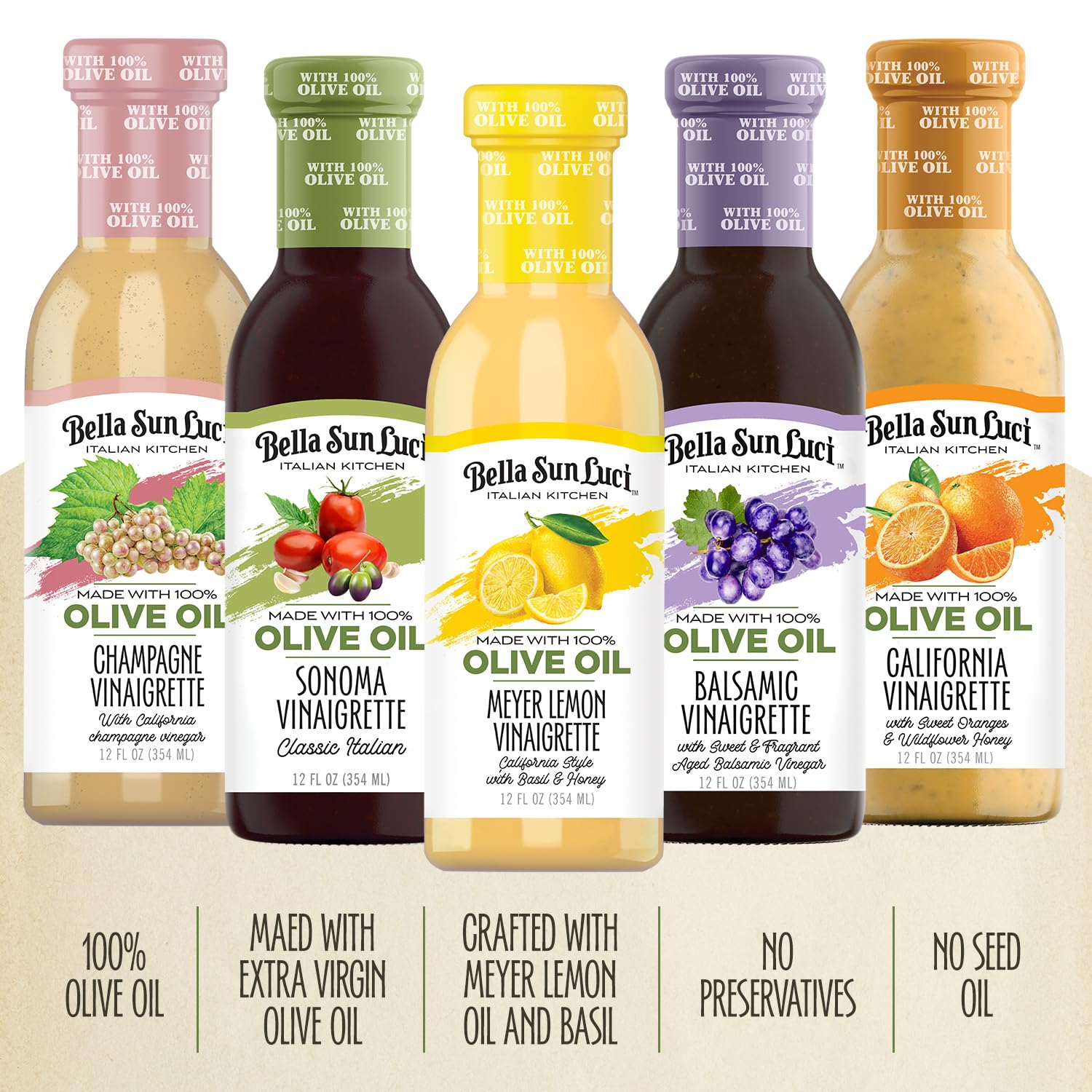 Bella Sun Luci Italian Kitchen Meyer Lemon Vinaigrette, 12 Fl Oz Glass Bottle, with 100% Extra Virgin Olive Oil, Artisan Gourmet Salad Dressing & Marinade, No Seed Oils, Gluten-Free, California Made