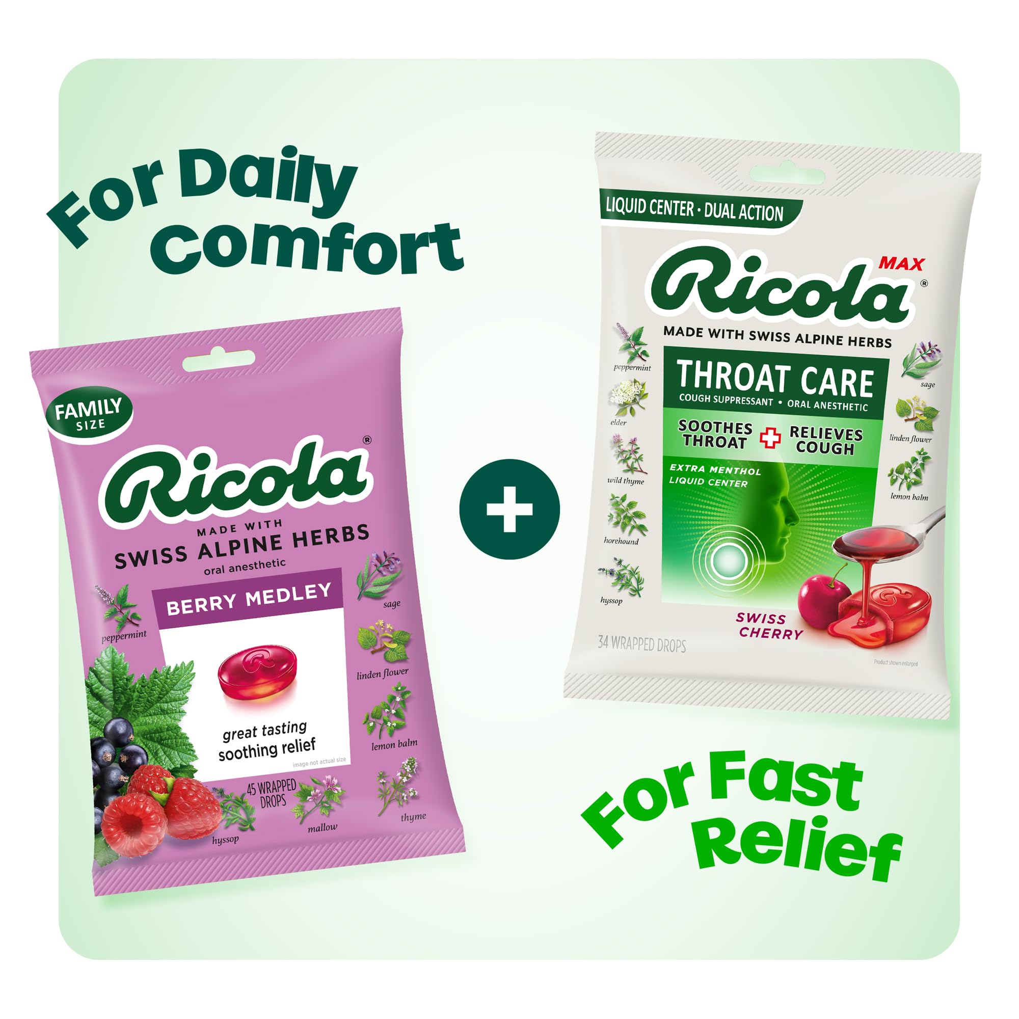 Experience maximum cough and sore throat relief with Ricola MAX Throat Care Swiss Cherry Throat Drops. Each drop delivers extra menthol, almost twice the menthol in Ricola Original Herb Throat Drops, to suppress coughs and soothe throat irritation. Ricola MAX Throat Care helps ease throat irritation, discomfort, and dryness to help you speak more comfortably. Made with Ricola's signature Swiss Alpine herb blend and a liquid center with extra menthol, these herbal throat lozenges combine the naturally refreshing flavor of real cherry concentrate with effective relief from cold and flu symptoms. Whether you're battling a cough or sore throat, Ricola MAX Throat Care Swiss Cherry delivers cooling, menthol relief you can count on. Stock up for home, work, and travel so soothing relief is always within reach.