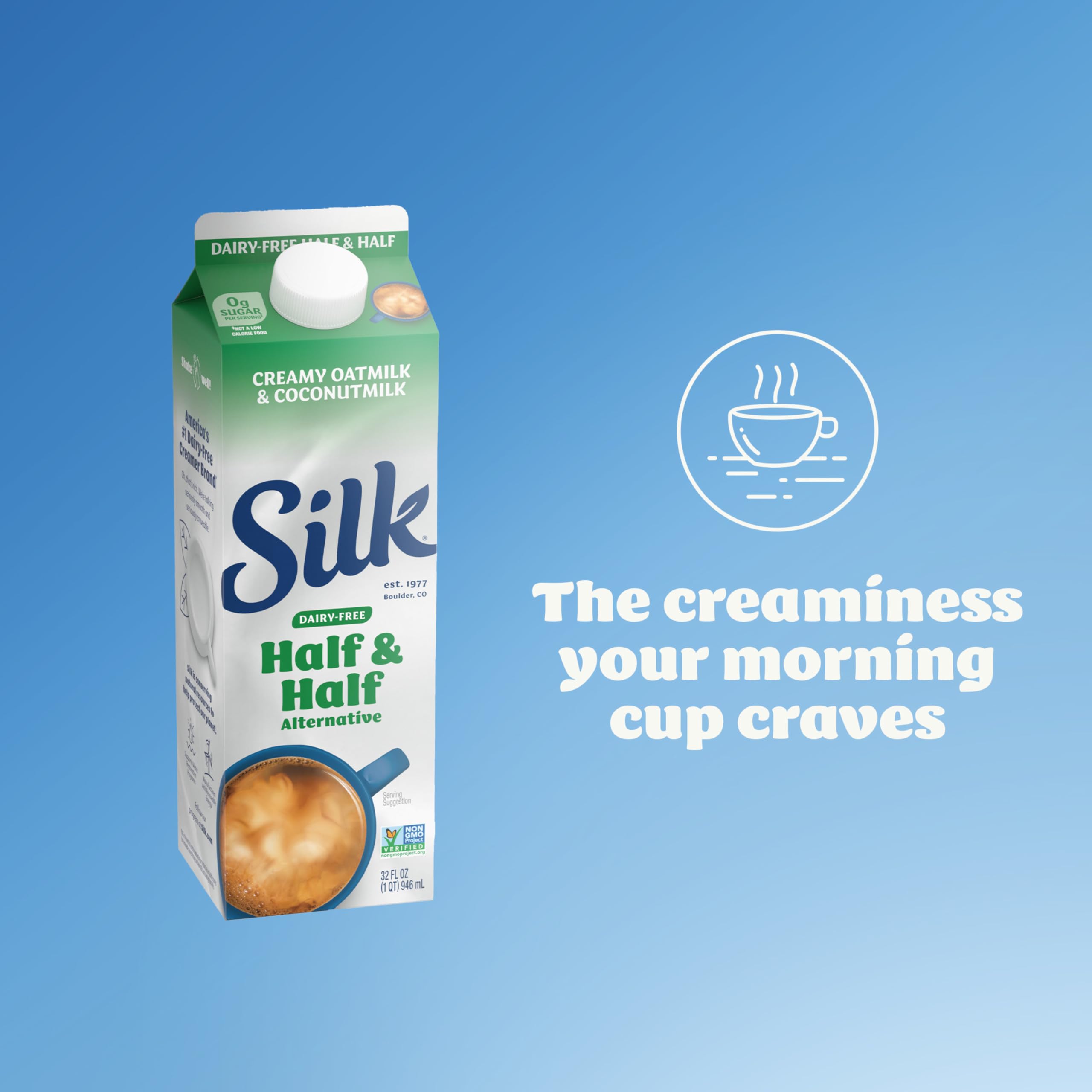 Make your days more flavorful with Silk Half & Half Alternative. Not your average coffee creamer, this smooth and lusciously creamy dairy free oat and coconut half and half creamer alternative is a great way to start your day. Plus, it's free of lactose, carrageenan, gluten and cholesterol and there are no artificial colors or flavors in this lactose free half and half alternative. Silk Half and Half alternative is a great choice for any lifestyle. Make a “me” moment by adding a splash of this vegan creamer alternative to smoothies, shakes, your morning coffee or anything that could use a smooth and creamy oat- and coconut-flavored boost. At Silk, we believe in the power of plants to do a world of good, so people can enjoy good, feel good and do good. Silk gluten free, non dairy creamer is the #1 brand of plant based creamers.* It’s also Non-GMO Project Verified. Level up your coffee experience with Silk Half and Half Alternative. *Leading brand based on national sales data.