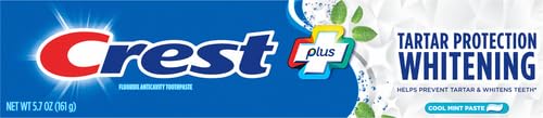 Crest Tartar protection Toothpaste fights tartar buildup and helps take care of your mouth. It also whitens teeth by removing surface stains. Pl, it'll leave your breath feeling fresh.