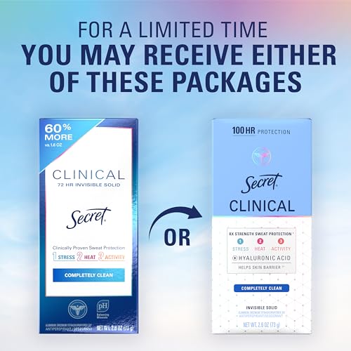 Secret Clinical Strength Antiperspirant Deodorant for Women, 100hr Sweat & Odor Protection, 3X Stress Protection with Hyaluronic Acid, PH Balanced, Invisible Solid, Completely Clean Scent, 2.6 oz
