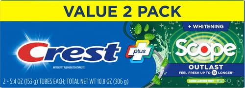 Long-lasting Scope Freshness. Crest + Scope Outlast Complete Whitening Toothpaste has the benefits of Crest toothpaste with the addition of Scope freshness. It helps fight bad breath germs to leave your breath feeling fresh up to 7x longer*. Regular brushing helps fight cavities and tartar build-up. Plus, it gently removes surface stains to help whiten your teeth. Feel it working and know that you’re covered with Crest. *vs. ordinary toothpaste