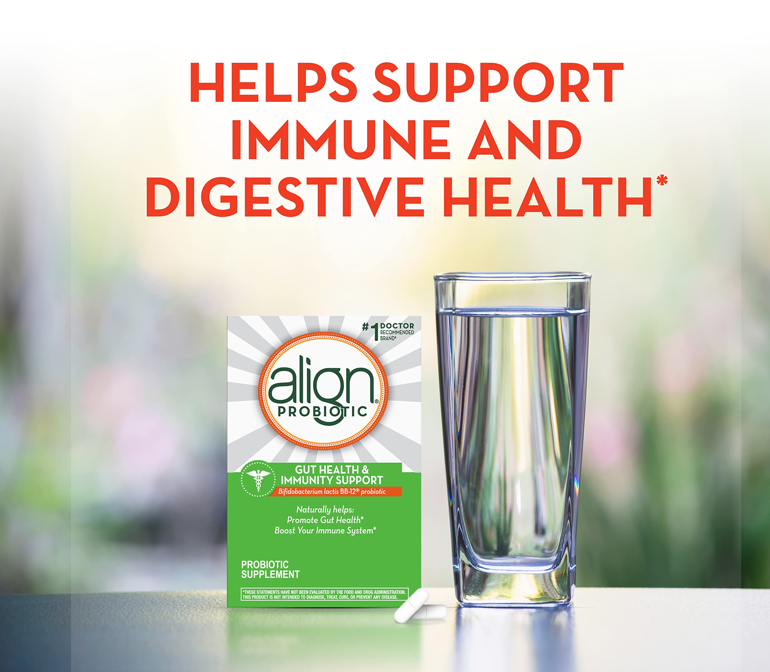 Good bacteria are essential to support a healthy gut, but common issues such as diet, travel, and stress can disrupt the natural balance of bacteria in your digestive system. To keep up with life, you have to take care of yourself, and supporting your gut and immune health is an important part of that. Your immune and digestive systems are closely related. In fact, 70% of your body’s immune system is located within your gut. Align Gut Health and Immunity Support helps fortify your digestive system with the probiotic strain Bifidobacterium lactis, BB-12®, which naturally helps promote healthy immune function*. Align Gut Health and Immunity Support supports a balanced and healthy immune system, is gluten-free, and does not require refrigeration*. Align Probiotic is nearly 2x more recommended by Gastroenterologists than any other probiotic brand. *THESE STATEMENTS HAVE NOT BEEN EVALUATED BY THE FOOD AND DRUG ADMINISTRATION. THIS PRODUCT IS NOT INTENDED TO DIAGNOSE, TREAT, CURE, OR PREVENT ANY DISEASE ‡Among Doctors and Gastroenterologists who recommended a brand of probiotic in ProVoice 2021 survey