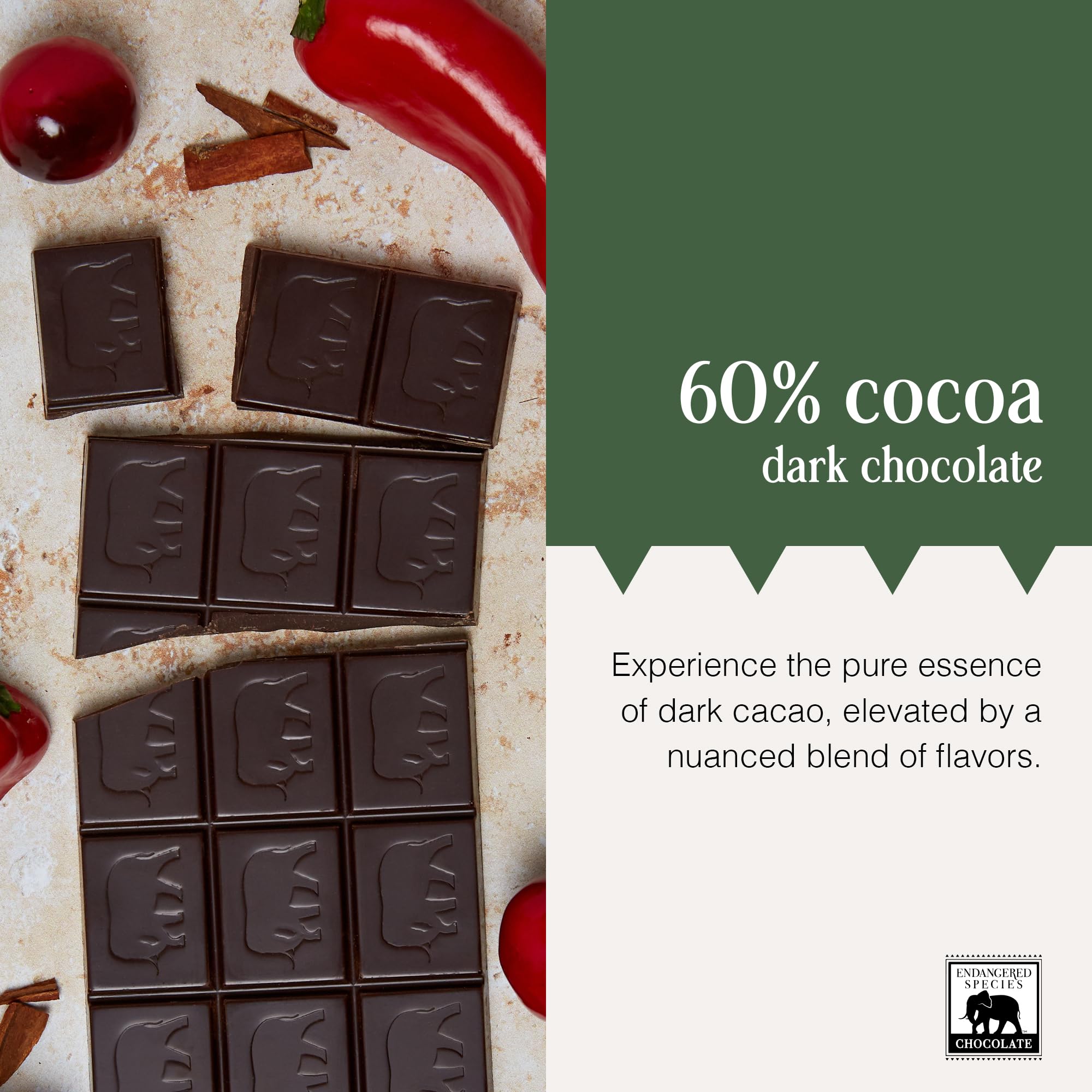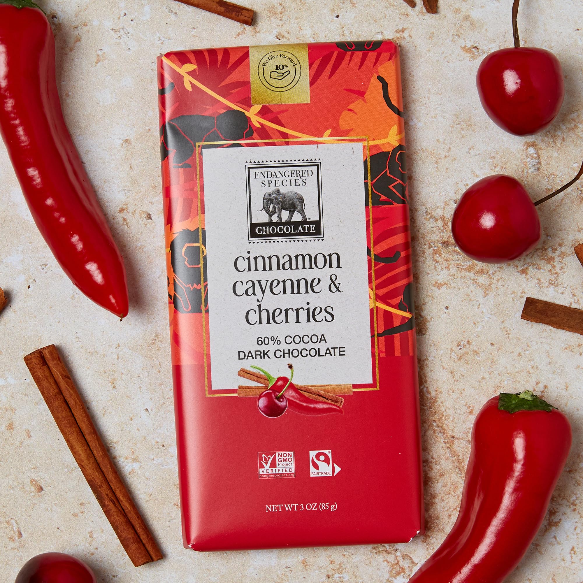 Endangered Species Natural Dark Chocolate Bar with Cinnamon Cayenne and Cherries, 3 Ounce - 12 per case.