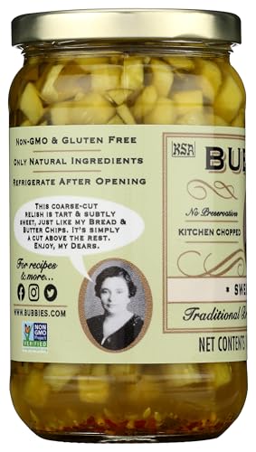 Gluten free. Non-GMO Project verified. nongmoproject.org. No preservatives. Kitchen chopped. This coarse-cut relish is tart & subtly sweet, just like my bread & butter chips. It's simply a cut above the rest. Enjoy, my dears. Bubbies Sweet Relish is a family recipe, perfected over generations. www.bubbies.com. For recipes & more. Facebook. Instagram. Twitter.