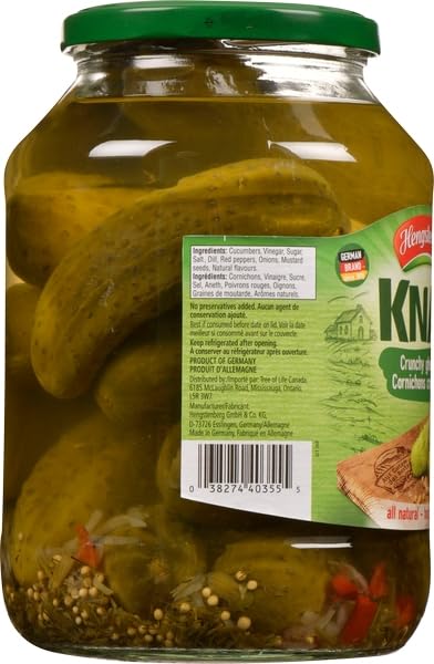 Hengstenberg is Germany's leader in pickles and sauerkraut. At Hengstenberg, all vegetables are processed and packaged within hours of harvesting to ensure a fresh, crunchy, and delicious product. This pairs well with salads, sandwiches, sausages, meat dishes, and more! These Hengstenberg Crunchy Gherkins contain no saturated fat, cholesterol, or preservatives. They are also all natural and gluten free! Product of Germany.