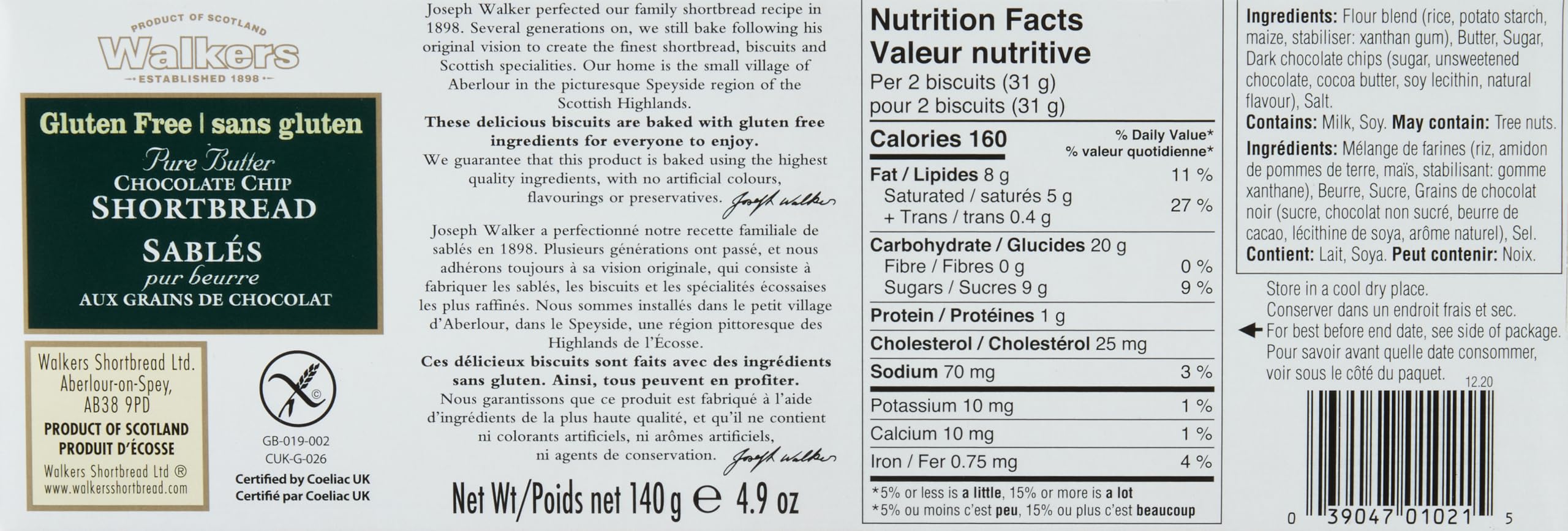 Walker's prides itself on making the world's finest shortbread and could not be more pleased to continue the tradition with this flavorful gluten free shortbread cookie. Our Gluten Free Chocolate Chip Shortbread contains a generous helping of chocolate chips, which provide a rich and luxurious complement to this classic shortbread cookie. Certified Gluten Free by the UK Coeliac Society and meets the FDA standard for gluten-free food of less than 20 parts per million of gluten. Every batch is tested to ensure compliance before being released. In the Walker's recipe, wheat flour is replaced by a blend of rice flour, maize flour, and potato starch. The Gluten Free Chocolate Chip Shortbread cookie contains the same butter and sugar content as the regular shortbreads, and as is Walker's custom, they contain no artificial flavorings or colorings. As with all Walker's shortbread, Gluten Free Chocolate Chip Shortbread contains no Genetically Modified Ingredients (GMOs) and no hydrogenated fats; is suitable for vegetarians; and is OU Kosher.