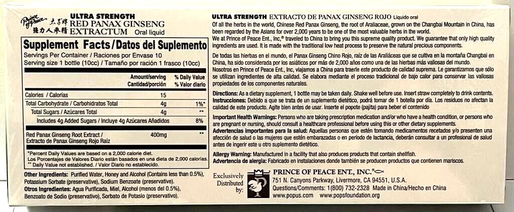 Prince Of Peace ginseng red extract. Enjoy the health benefits of ginseng anytime, anywhere with Prince of Peace Red Ginseng Extract. *This product is made with Korean ginseng, which can easily support your body's energy at home, work, or travel. * The liquid formula is easy to carry around. It can be carried in a backpack, purse, or pocket to supplement your health while on the go. *