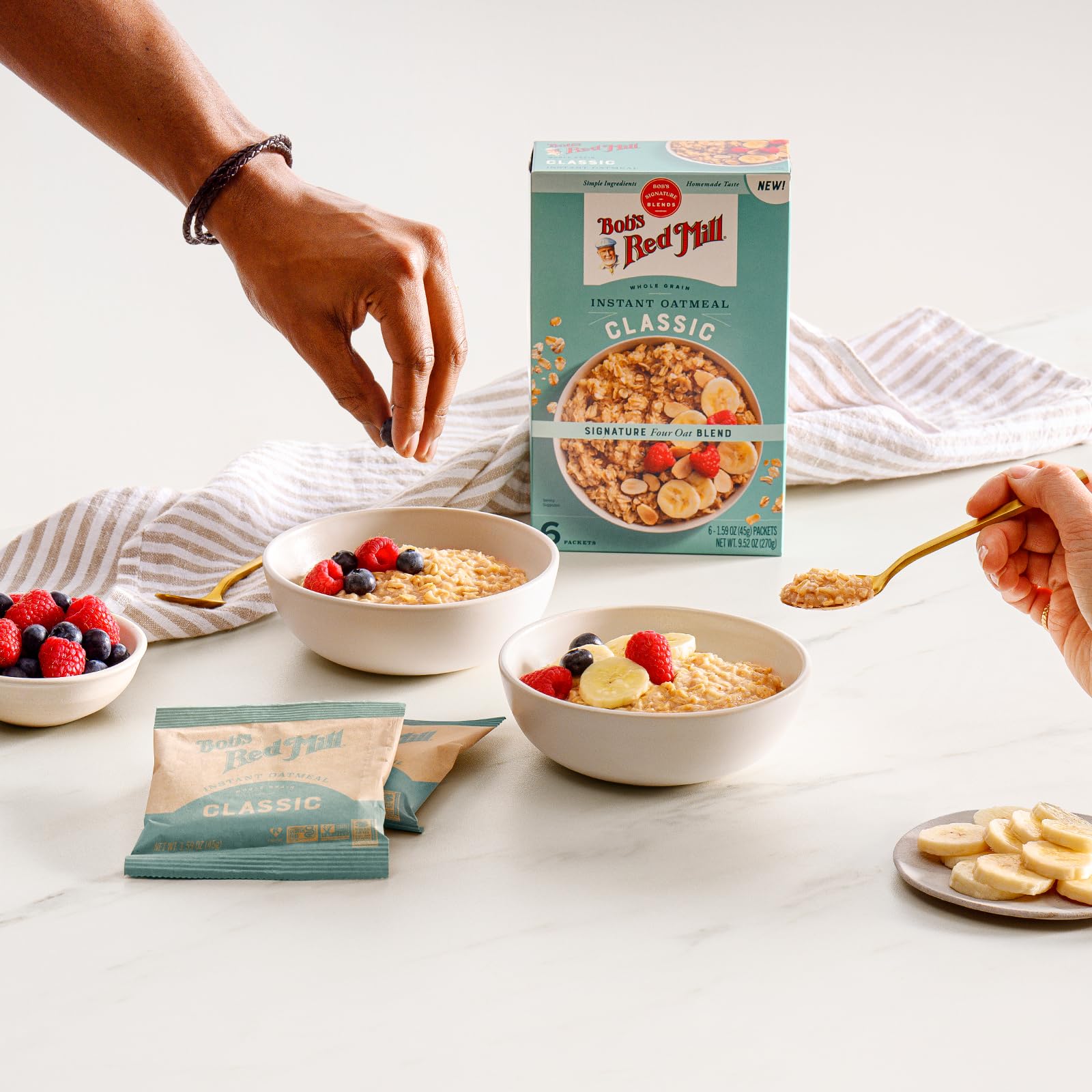 Good mornings are made simple with Bob’s Red Mill Classic Instant Oatmeal. Crafted with Bob’s Signature Four Oat Blend—featuring whole grain rolled oats, quick oats, Scottish oats and oat bran—this premium instant oatmeal delivers scratch-quality texture and flavor in minutes. In just three minutes, serve up a thick, creamy bowl with just the right balance of chewiness and cozy comfort. Made with 100% whole grains, it’s a nourishing way to fuel your day with 5 grams of protein. Each packet is a good source of fiber, helping you feel full and satisfied. Enjoy on its own or customize with your favorite toppings like fresh fruit, nuts or a drizzle of honey. Whether at home, at work or on the trail, these convenient single-serve packets bring wholesome goodness wherever the day takes you. Bob’s Red Mill makes it easier than ever to enjoy the World’s Best Oatmeal.