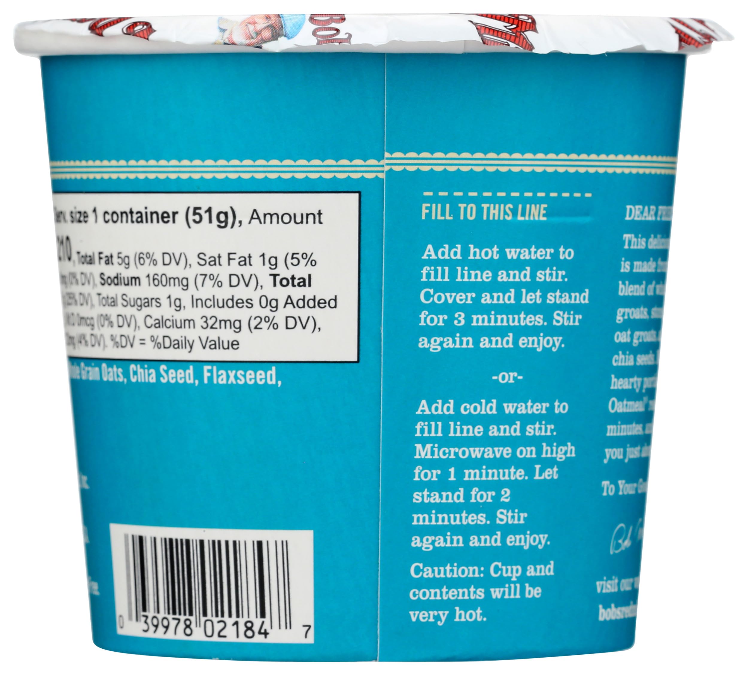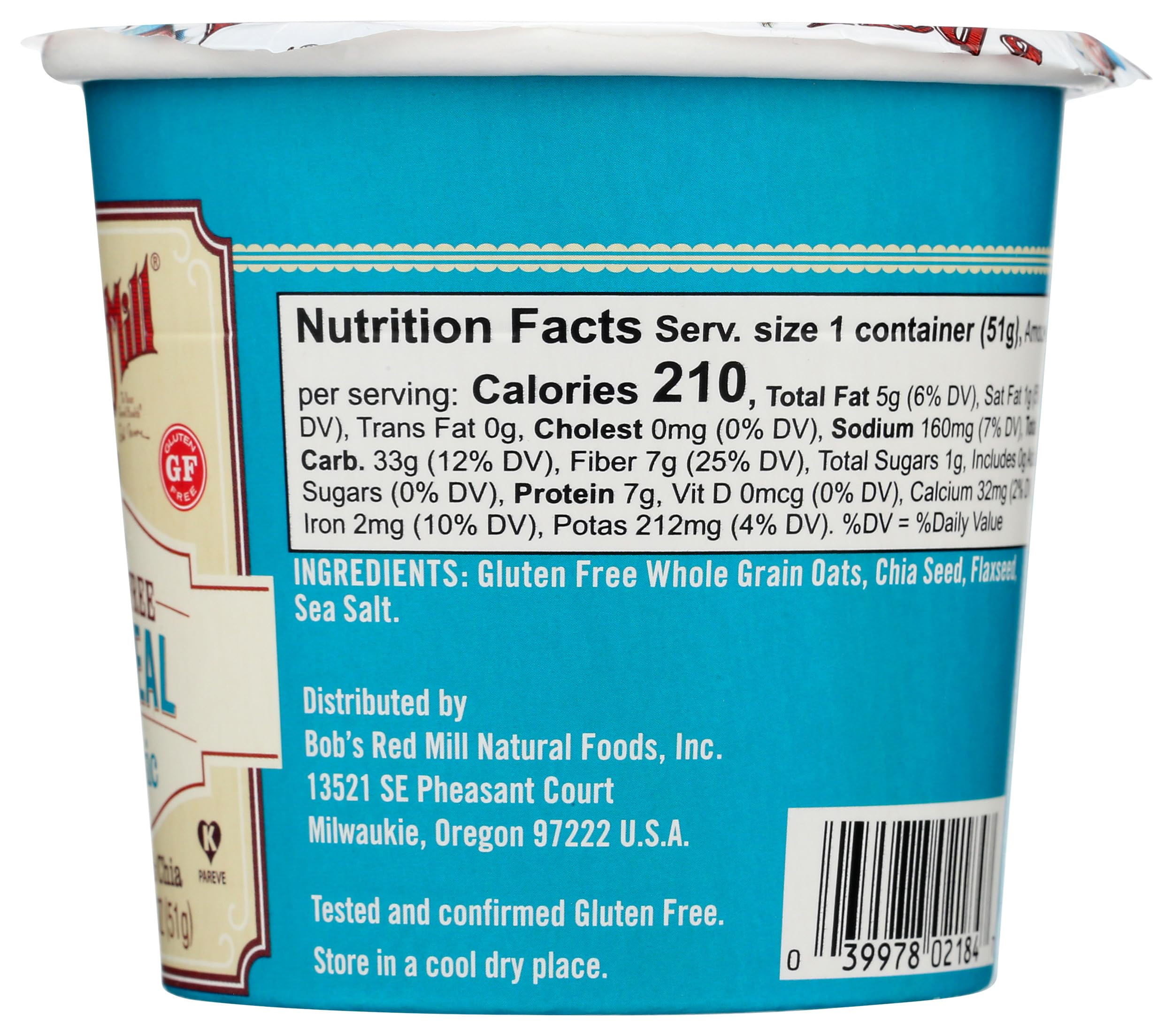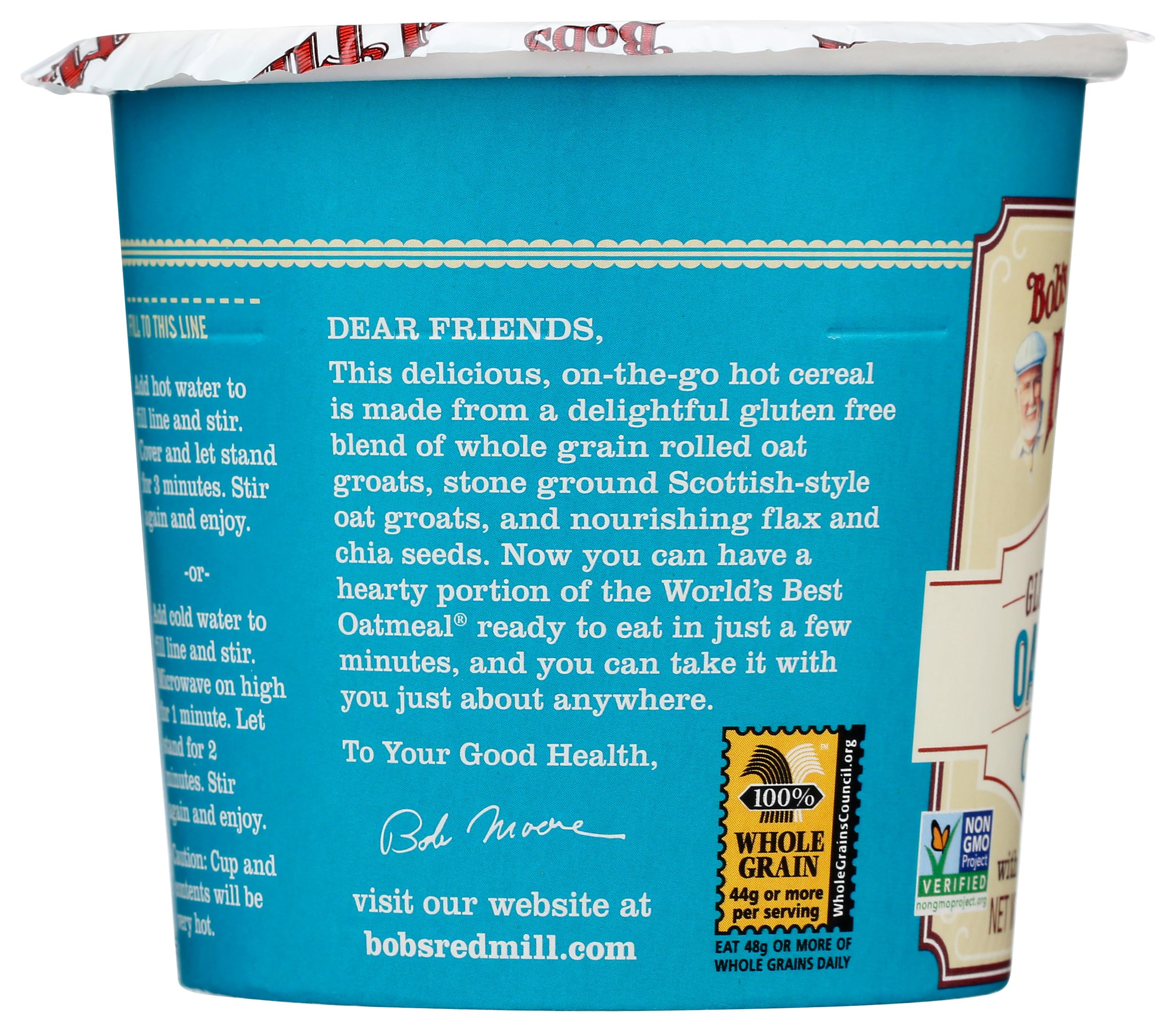 Enjoy simple ingredients and homemade taste—to go—with Bob's Red Mill’s Classic Oatmeal Cup. This whole grain breakfast is ready in 3 minutes and made with a blend of premium old-fashioned rolled oats, quick oats and stone-ground Scottish oats, with flax and chia seeds for extra flavor and fiber. No bowl required: just add hot water or heat in the microwave for delicious oatmeal in minutes! The perfect base for your favorite toppings, or enjoy its classic, simple flavor as-is.