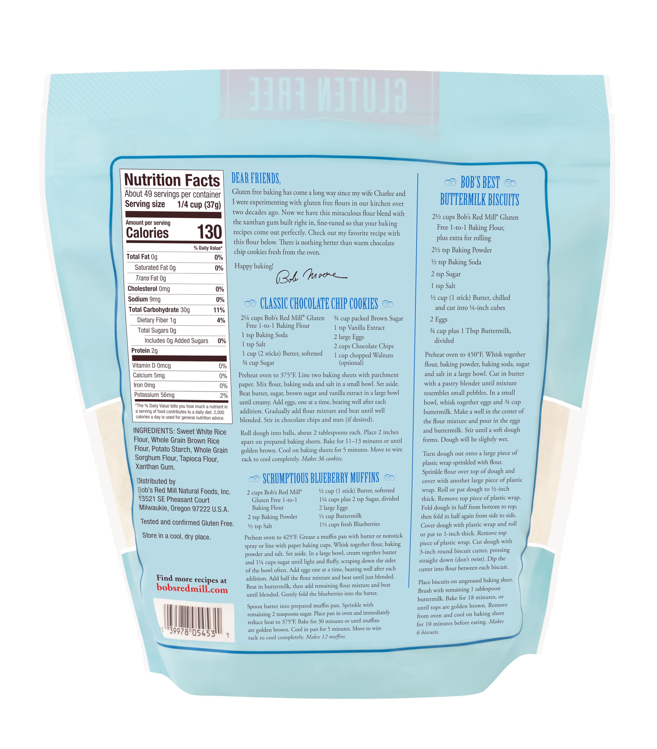 Delicious moments to share start with good ingredients for all. Bob’s Red Mill measures and blends high-quality ingredients like gluten free flours, starches and xanthan gum to create this easy-to-use gluten free flour blend, a one-to-one replacement for wheat flour. Now it’s easy to transform traditional cookies, cakes, brownies, muffins and pancakes into gluten free treats—replace your flour, not your recipes!