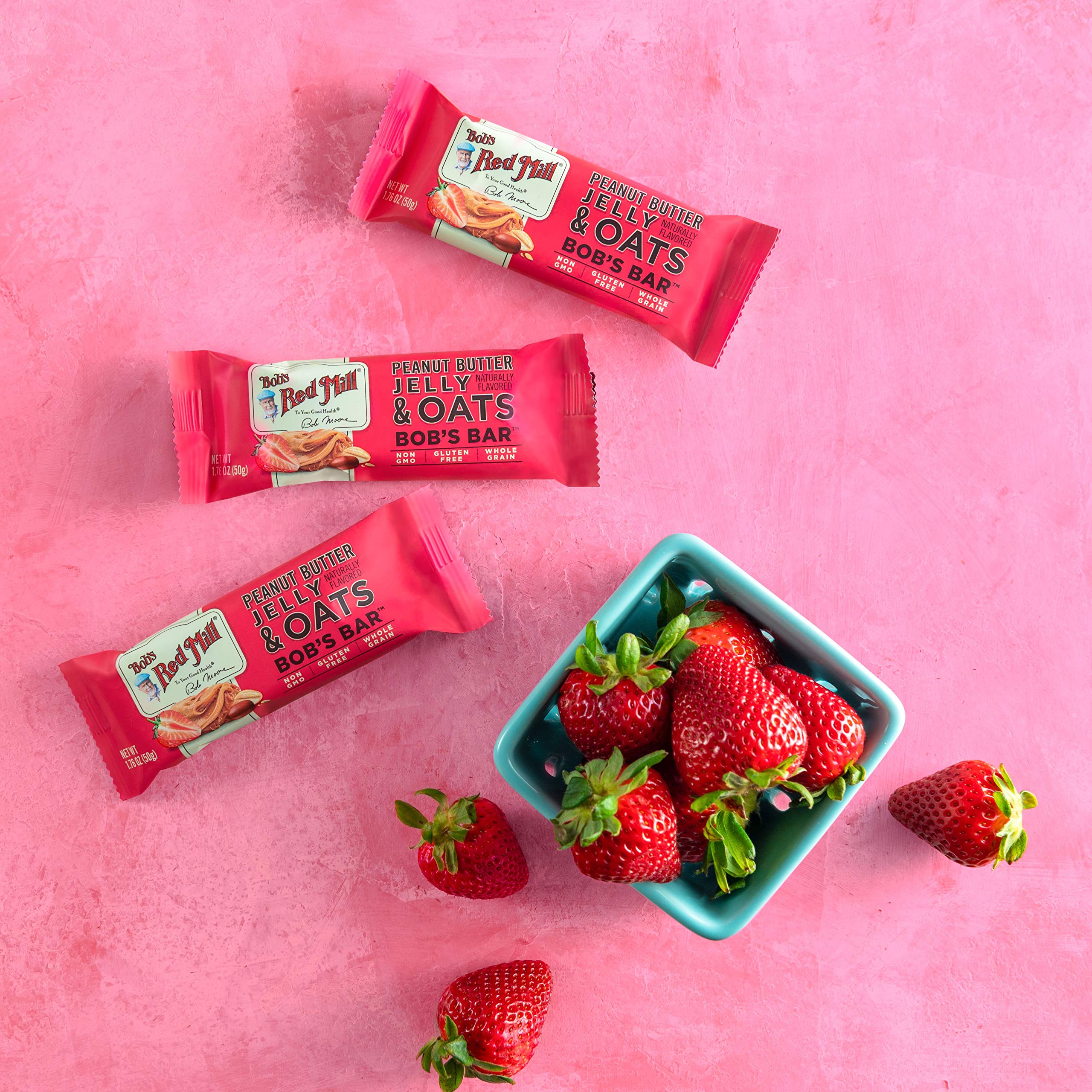 Bob’s Red Mill’s Peanut Butter Jelly & Oats Bob's Bar 5-Pack tastes just like a peanut butter and jelly sandwich and offers simple, convenient nourishment. Inspired by a Moore family favorite made with whole grain oats, creamy peanut butter and organic honey, these bars are a versatile snack you can enjoy anytime, anywhere. Each bite is packed with rich flavor and simple ingredients to fuel your day, whether you’re tackling a hike, running errands, or enjoying a midday treat. With a simple, clean ingredients list, Bob’s Bars are free from gluten, soy, dairy and eggs, making them a great choice for a variety of dietary needs. They're also Non-GMO Project Verified, gluten free and kosher, so you can trust in the quality of every bar. With 6 grams of hearty protein and just 9 grams of sugar per bar, they strike the perfect balance of indulgence and nutrition. Keep a box on hand for school lunches, office snacks or post-workout refueling, and treat yourself to the goodness of peanut butter and jelly!