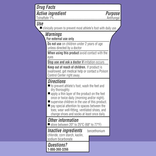 Prevent the uncomfortable itching, burning, cracking, and scaling symptoms of athlete's foot with Lotrimin AF daily prevention Medicated foot powder. It also absorbs sweat, helping to keep your feet dry and destroys odor. The active ingredient in this athlete's foot prevention powder is Tolnaftate, which is clinically proven to prevent most athlete's foot fungus. Prevent and stop the growth of most athlete's foot fungus with the power of Lotrimin AF daily prevention Medicated foot powder - your tinea Pedi's is no match for this prevention product that works to stop the fungus that causes athlete's foot. Safe for kids over 2. Use as directed.