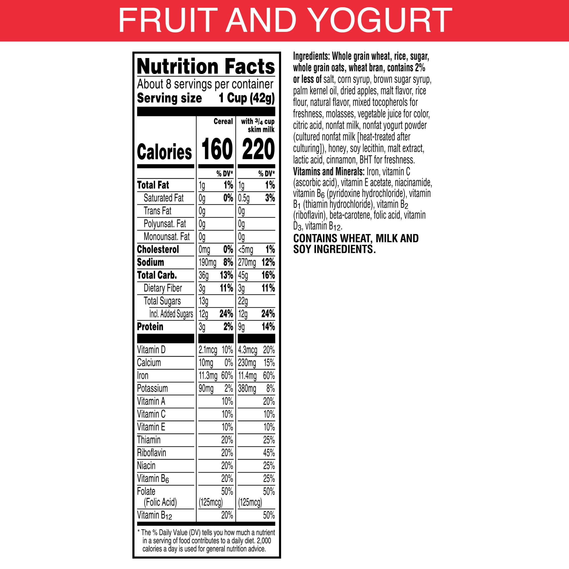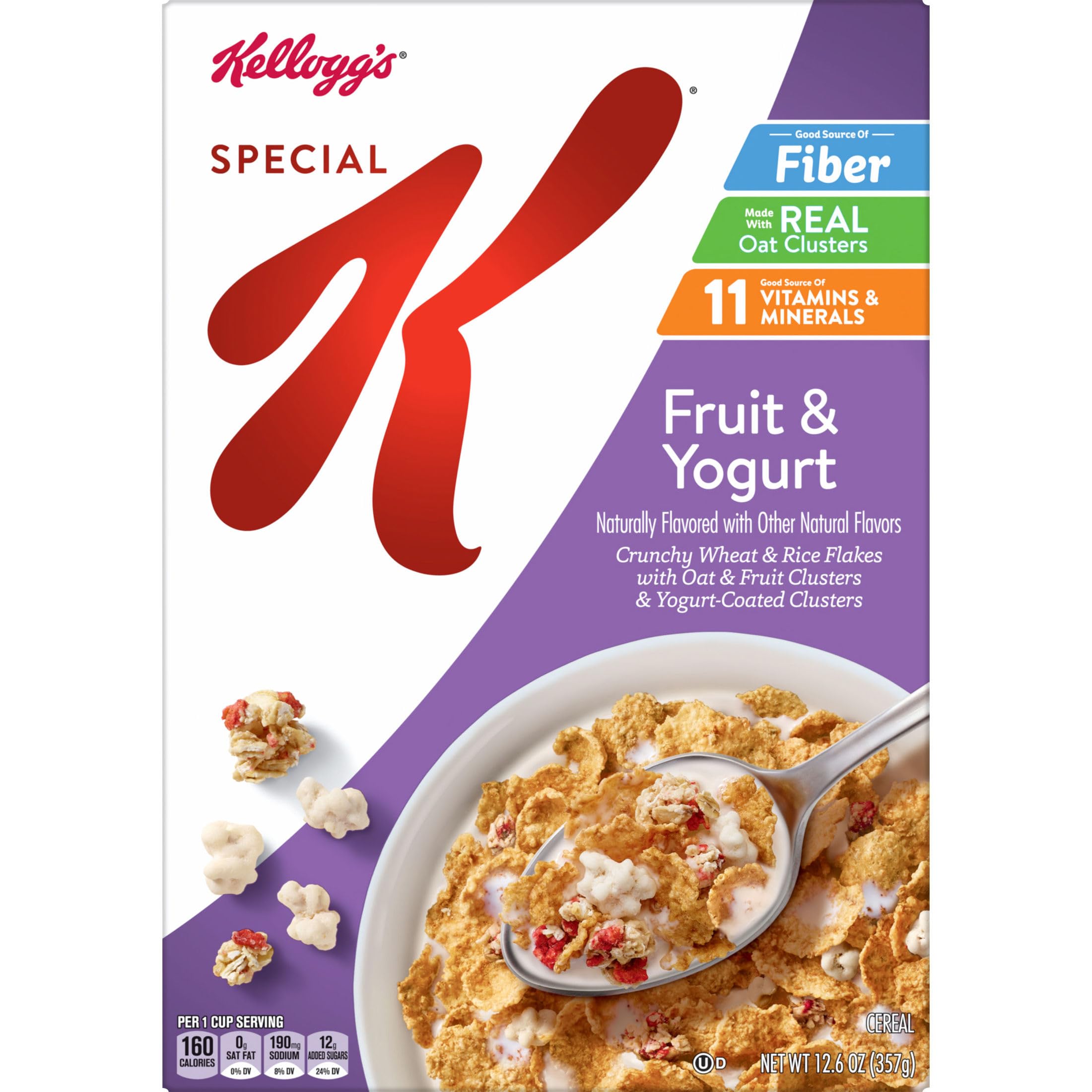 Do what's delicious with Special K Fruit and Yogurt. Crisp rice and wheat flakes made with real oat clusters with fruit and yogurt help you stay on track for the day ahead. Nutritious and delicious, every bowl provides a good source of 11 vitamins and minerals. Made with fiber, B vitamins, and iron, plus Vitamins A, C, and E as antioxidants women need (beta-carotene (source of vitamin A)); Make it an irresistible, low-fat part of a quick breakfast, lunch, dinner or late-night snack. Try it as a work day or between-meal treat. Enjoy this healthy cereal with dairy or nut-milk. Add it to your favorite yogurt, smoothie, or trail mix recipe. Whether you enjoy your cereal at home, work, school, or the gym, you'll love the sweet and satisfying taste. Kids and adults both love the taste of real oat clusters with fruit and yogurt paired with your favorite milk. Morning time or any time, Kellogg's Special K Fruit and Yogurt cereal is a flavorful choice the whole family can feel good about.