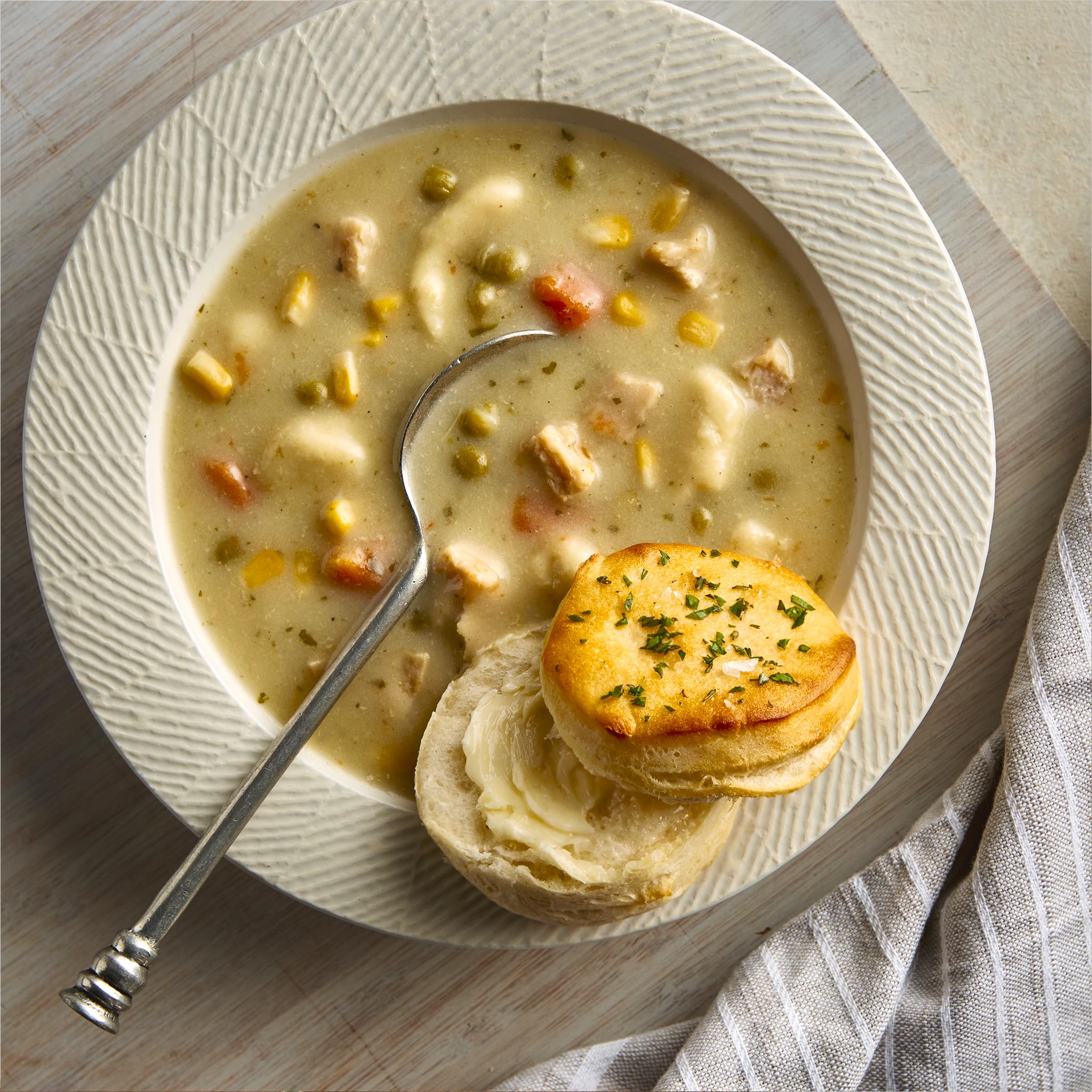 Progresso Hearty Chicken Pot Pie Style with Dumplings canned soup is the perfect food for chilly weather. Enjoy each delicious bite of our rich, hearty soup made with white meat chicken, carrots, celery, corn, and delectable, savory dumplings. This creamy soup can warm up the coldest of days or be a comfort during cold and flu season. Whenever you're feeling under the weather, add Progresso canned soups to your shopping list of essentials, such as tissues, cold or cough medicine, or cough drops. This soup is quick and easy to microwave and can be ready to eat in minutes. Progresso Chicken Pot Pie Style with Dumplings canned soup has no artificial flavors or colors from artificial sources. Just the taste you expect from Progresso. At Progresso, we're passionate about making great products. We've been creating premium soups for more than 100 years. And today, Progresso still uses quality ingredients for a tasteful flavor found only in our line of canned soup products. Contains one 18.5 oz can of shelf-stable Progresso Hearty Chicken Pot Pie Style Soup with Dumplings; about two servings per can.