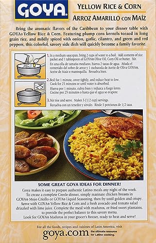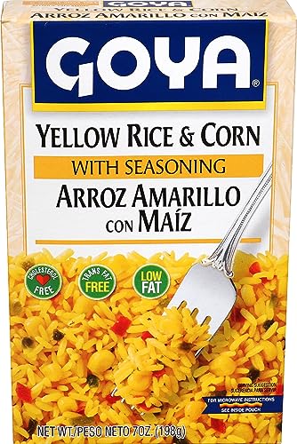 Goya Foods Yellow Rice and Corn, 7 Ounce (Pack of 12) | Meat, fish, chicken and vegetable lovers can complement their dishes with this versatile, easy-to-make GOYA Yellow Rice and Corn. Its secret blend of onion, corn, garlic and other rich Latin spices goes perfectly with any meal. It can be used as an ingredient in a flavorful main dish or as a tasty side dish. GOYA Yellow Rice and Corn is low fat free, saturated fat free and trans-fat free, and cholesterol free.