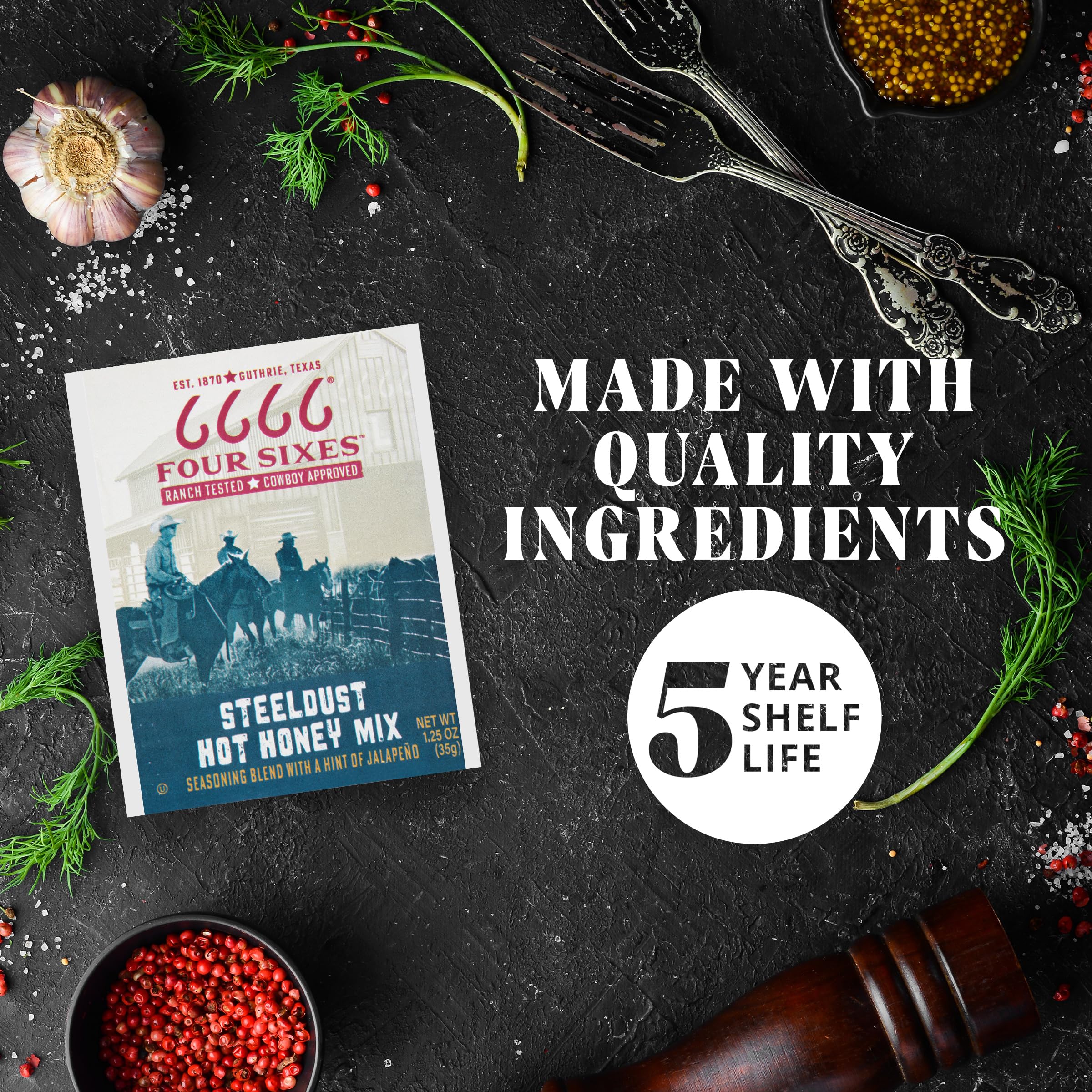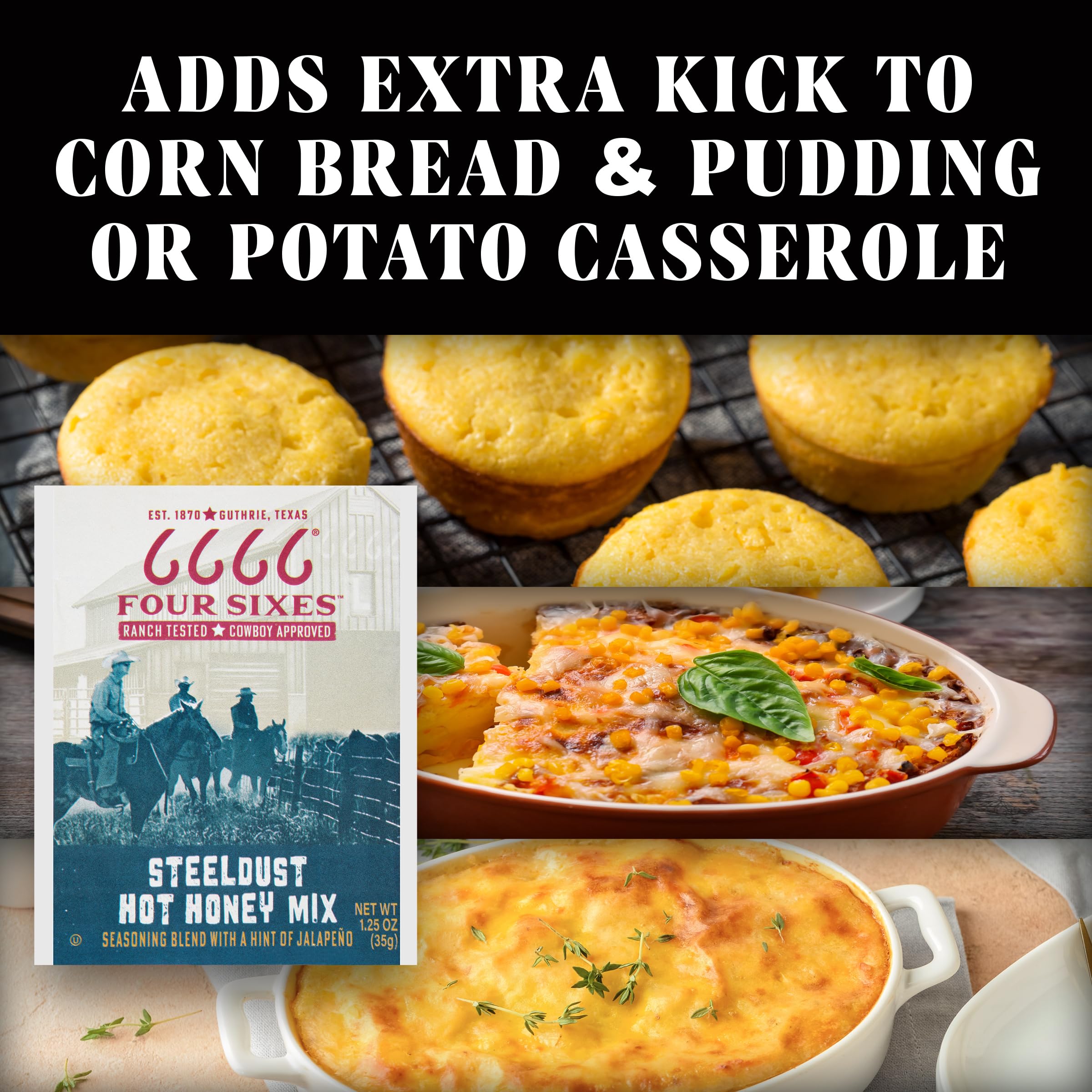 Saddle up for a taste of true Texas heritage with the 6666 4 Sixes Steeldust Hot Honey Mix. Whether you're marinating chicken or cornbread, this versatile seasoning mix adds a spicy kick to your favorite dishes, with the perfect blend of jalapeno heat and sweet honey. The unique spice blend ensures that each packet delivers bold flavors that evoke the spirit of the Lone Star State. A hot honey seasoning mix will bring out the best in every bite, ensuring a flavorful masterpiece every time. Whether you're grilling, baking or roasting, this seasoning blend is sure to impress, delivering a taste of Texas to your dinner table. Packaged for convenience with a five-year shelf life, each 1.25 oz packet ensures you always have bold Texas flavors at your fingertips. Embrace the heat with 6666 4 Sixes Steeldust Hot Honey Mix—because in Texas cooking, a little spice makes everything nice.