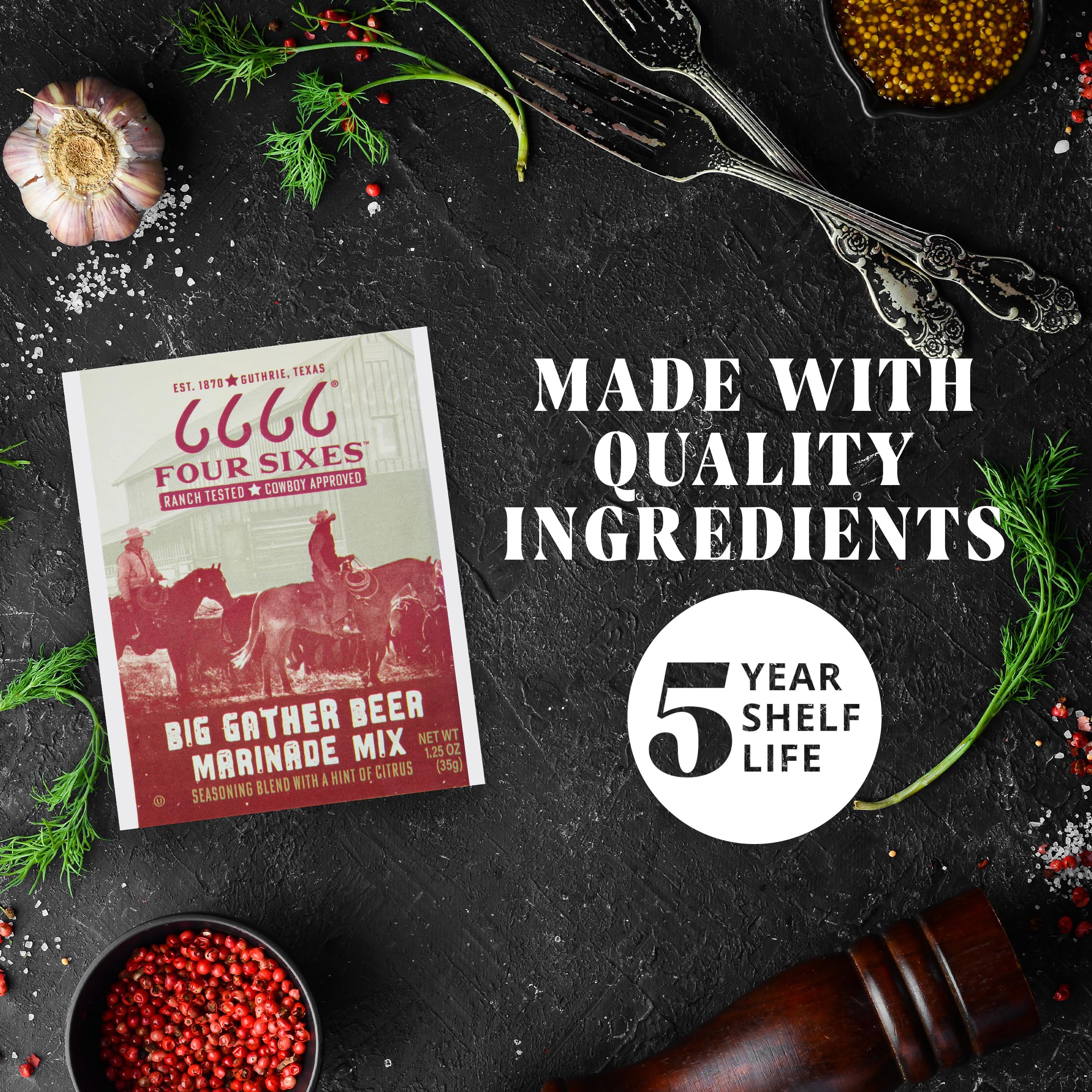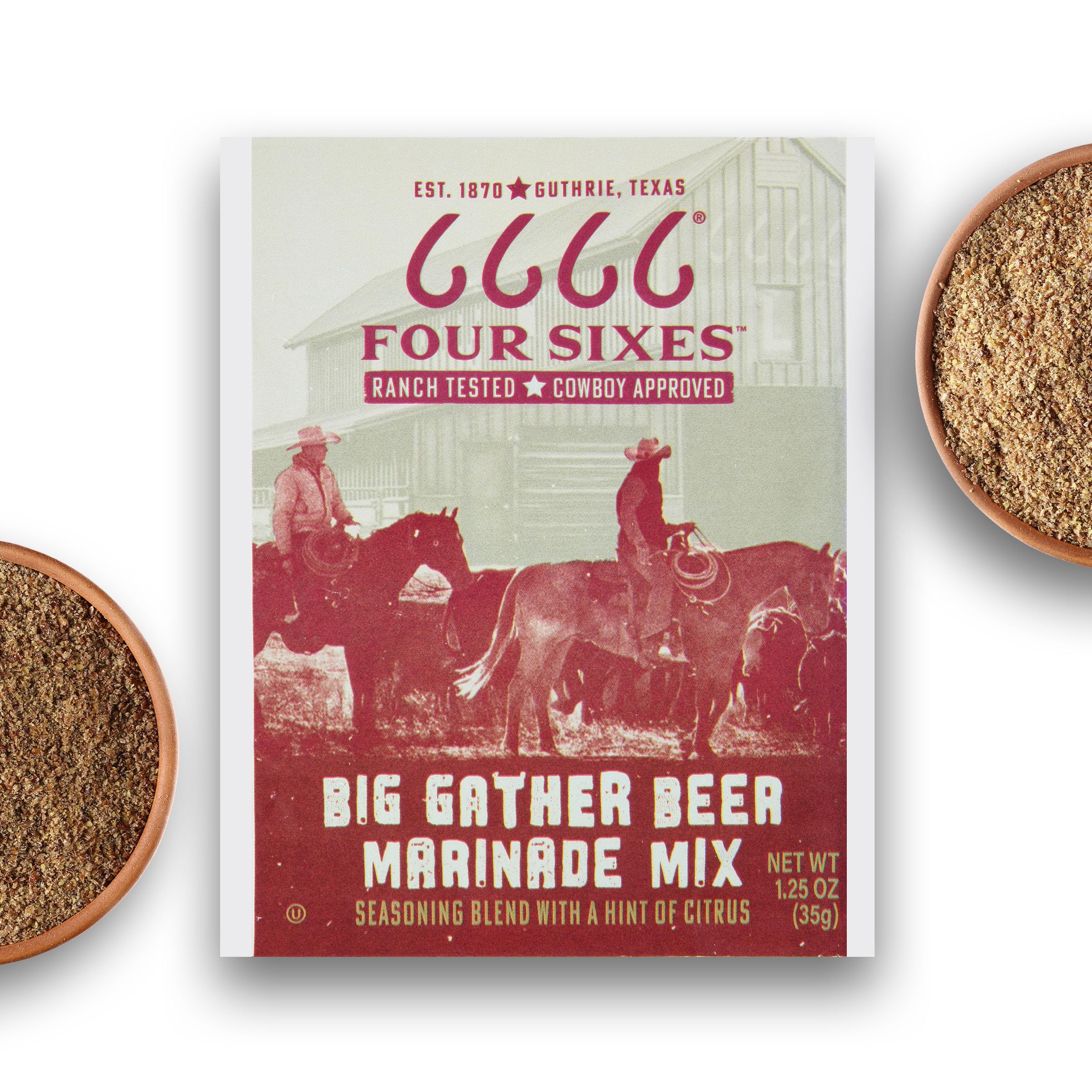 Saddle up for a taste of true Texas heritage with the 6666 4 Sixes Big Gather Beer Marinade Mix. Whether you're marinating a pork chop or salmon, this versatile seasoning mix combines a citrus blend with the rich taste of pilsner beer. The unique spice blend ensures that each packet delivers bold flavors that evoke the spirit of the Lone Star State. A meat marinade seasoning mix brings out the best in every bite, ensuring a flavorful masterpiece every time. Whether you're grilling, baking or roasting, this seasoning blend is sure to impress, delivering a taste of Texas to your dinner table. Packaged for convenience with a five-year shelf life, each 1.25 oz packet of our seasoning mix packets ensures you always have bold Texas flavors at your fingertips. This beer marinade mix is the perfect addition to any meal so go ahead, turn an ordinary dish into an extraordinary experience with 6666 4 Sixes Big Gather Beer Marinade Mix—because when it comes to Texas cooking, bold is best.