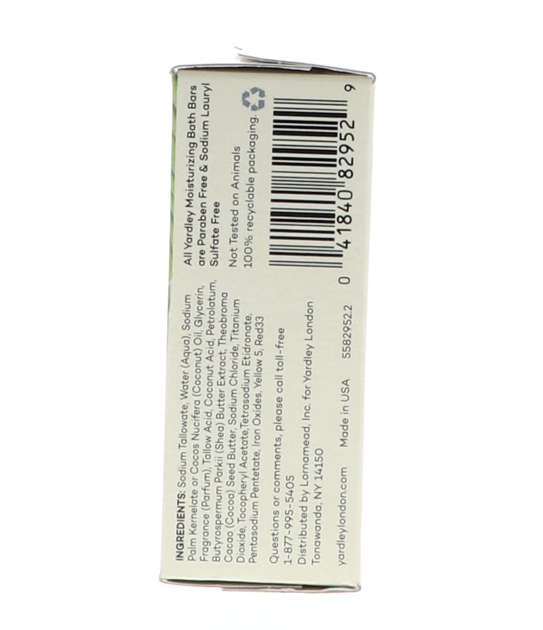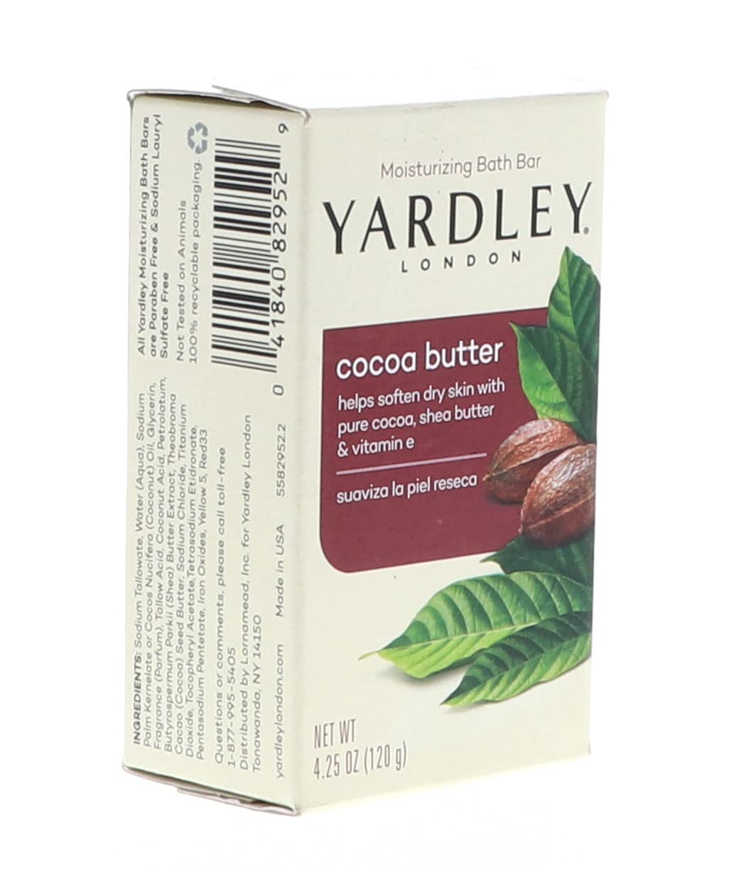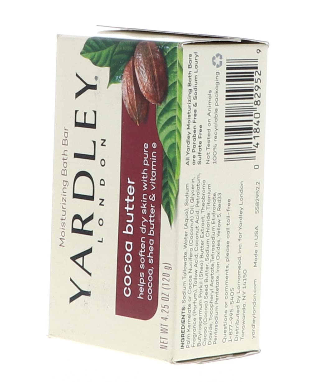 Yardley London Cocoa Butter Moisturizing Bath Bar is made with cocoa butter, shea butter, and vitamin E to provide gentle cleansing suitable for everyday use. The bar produces a rich lather that helps wash away impurities while leaving skin feeling soft and comfortable. The fragrance blends cocoa butter with floral and warm notes for a classic bath-time experience. This formula is free from parabens and sodium lauryl sulfate and is not tested on animals.