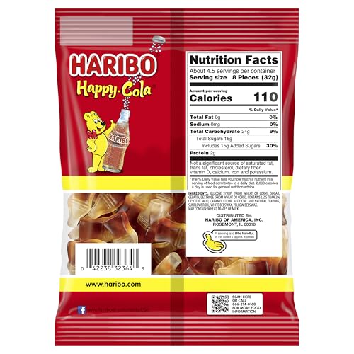Haribo Happy Cola Gummy Candy. Bite size gummi candy that is not only shaped like an old time soda bottle, but also has a great cola taste. We are sure this is what gummy bears drink to make the taste so gummi good. More favorite gummi candy from Haribo i