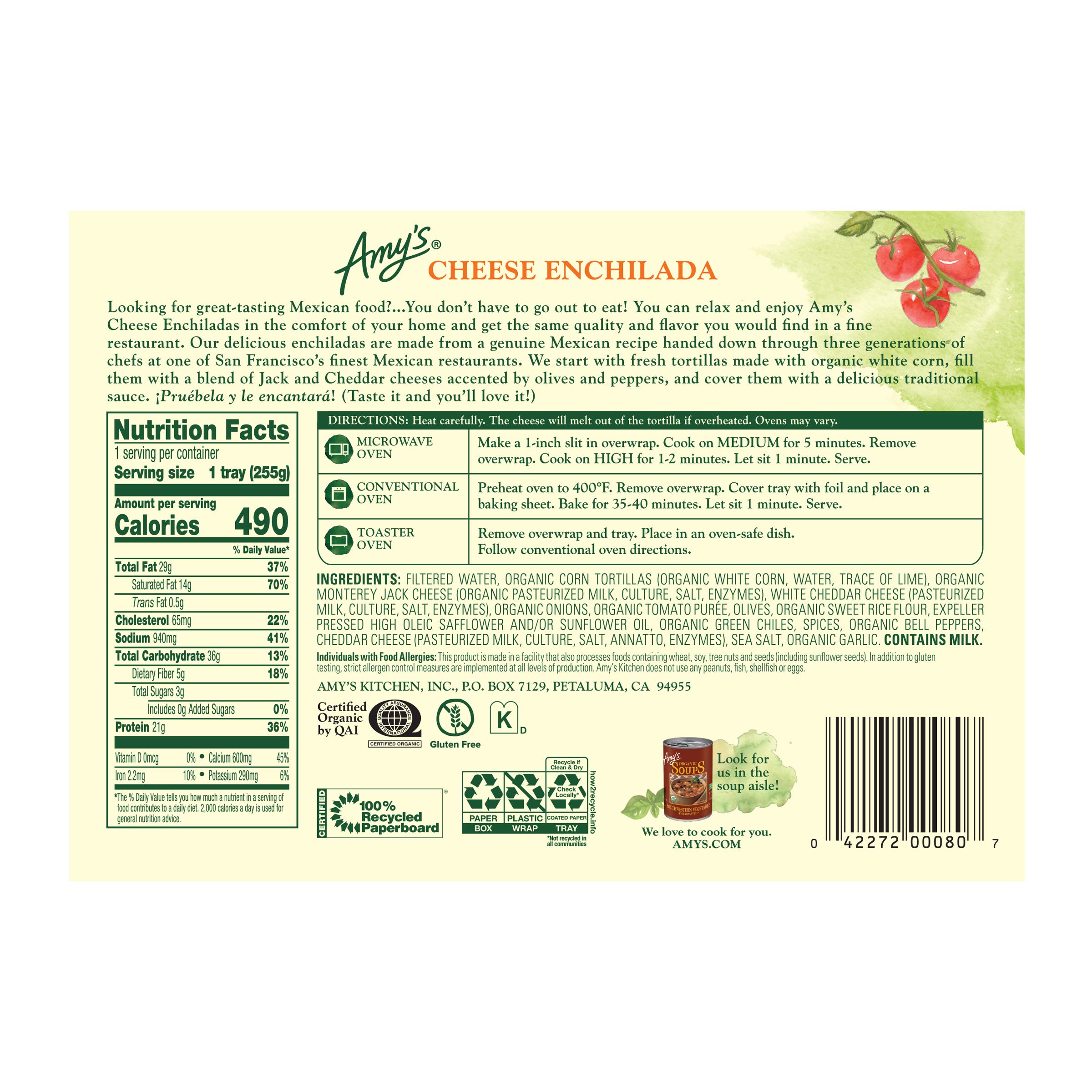 This is comfort food, Mexican style! One box of Amy’s Cheese Enchiladas includes two tortillas made from ground organic corn filled with a blend of creamy cheeses, peppers and olives and covered in our tasty, traditional enchilada sauce. The recipe for our sauce has been handed down for generations, with a special blend of spices. Made with only the highest quality ingredients, Amy's Cheese Enchiladas are gluten free, soy and tree nut free, certified kosher and suitable for vegetarian diets. They’re also convenient and easy to prepare. Simply heat and serve! Since 1987, we at Amy’s Kitchen have produced delicious, convenient foods for people who are sometimes too busy to cook. Amy’s is a family-run business, and we supervise every aspect of our business and take pride in customer satisfaction. All the fruits, vegetables and grains we use are grown without the use of insecticides, GMOs and other harmful chemicals. We prepare these ingredients with the same careful attention in our kitchen as you would in your own home for high-quality, home-style vegetarian and vegan meals. No meat, fish, shellfish, poultry, eggs or peanuts are ever used in any Amy's products. Even though you're heating up our meals in your home, we want each bite to taste like you're a guest in ours.