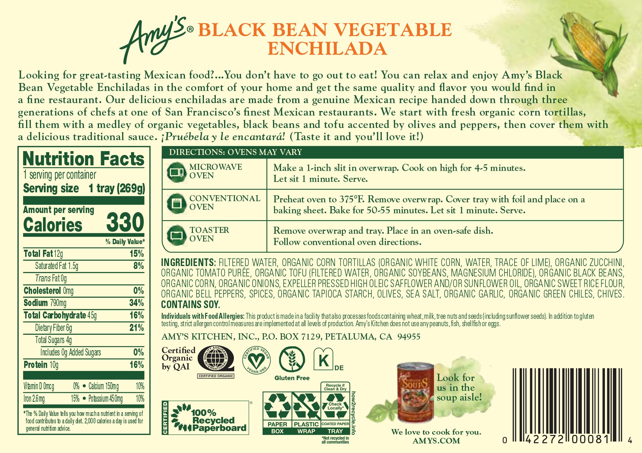 Amy's Frozen Black Bean Burrito is filled with savory, organic black beans and delicious vegetables, all in our mild Mexican sauce and wrapped in a tender, hand-wrapped flour tortilla. This delicious burrito is made from scratch and can be prepared quickly for sure-fire satisfaction. Simply heat up and serve this burrito for nearly any meal, even try topping it with a spoonful of Amy's Salsa! Amy's Black Bean Burritos contain wheat and are made with non GMO ingredients. They are also soy and tree nut free, dairy and lactose free, and are suitable for vegan and kosher diets. At Amy’s Kitchen goodness is our guiding principle. Since 1987, we at Amy’s Kitchen produce delicious, organic convenient foods for people who are sometimes too busy to cook. Amy’s is a family-run business, and we supervise every aspect of our business and take pride in customer satisfaction. All the fruits, vegetables and grains we use are grown without the use of insecticides, GMOs and other harmful chemicals. We prepare these ingredients with the same careful attention in our kitchen as you would in your own home for high-quality, home-style vegetarian and vegan meals. No meat, fish, shellfish, poultry, eggs or peanuts are ever used in any Amy's products. Even though you're heating up our meals in your home, we want each bite to taste like you're a guest in ours.