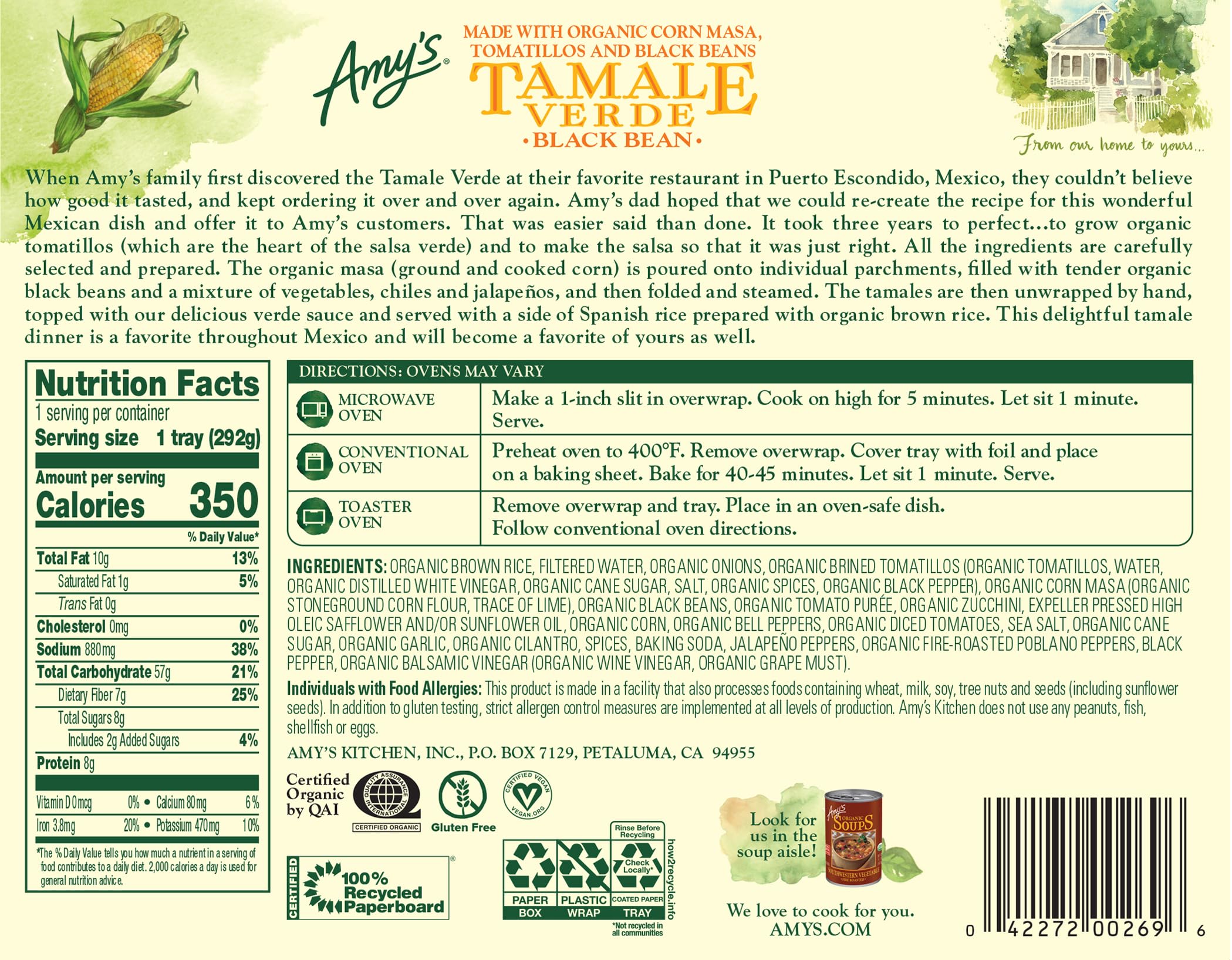 Amy's Black Bean Tamale Verde is made with traditionally-prepared organic corn masa, black beans, vegetables, chiles and jalapeños. Then, it is hand-folded into parchment, steamed, unwrapped then topped with our house-made verde sauce and served alongside organic Spanish rice. Simple to prepare and serve, this Amy's Black Bean Tamale Verde is gluten free, dairy and lactose free, soy free, tree nut free and suitable for vegan diets. At Amy’s Kitchen goodness is our guiding principle. Since 1987, we at Amy’s Kitchen produce delicious, organic convenient foods for people who are sometimes too busy to cook. Amy’s is a family-run business, and we supervise every aspect of our business and take pride in customer satisfaction. All the fruits, vegetables and grains we use are grown without the use of insecticides, GMOs and other harmful chemicals. We prepare these ingredients with the same careful attention in our kitchen as you would in your own home for high-quality, home-style vegetarian and vegan meals. No meat, fish, shellfish, poultry, eggs or peanuts are ever used in any Amy's products. Even though you're heating up our meals in your home, we want each bite to taste like you're a guest in ours.