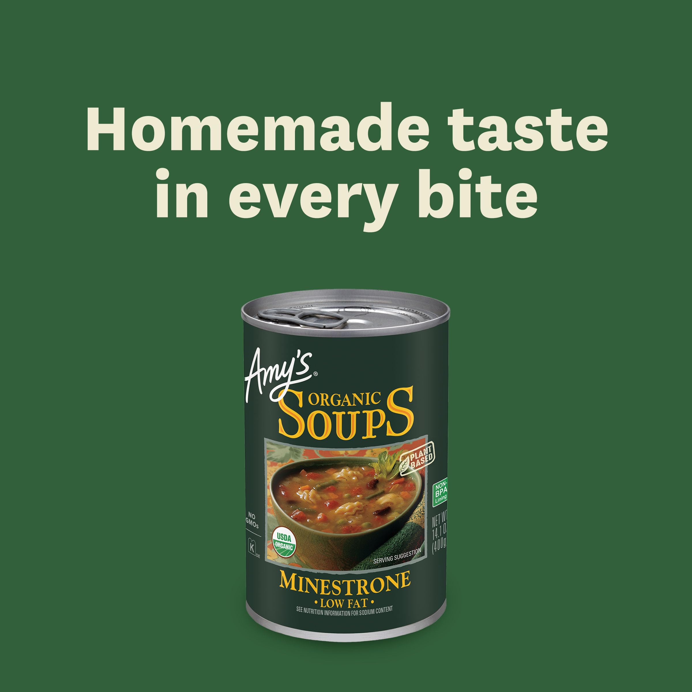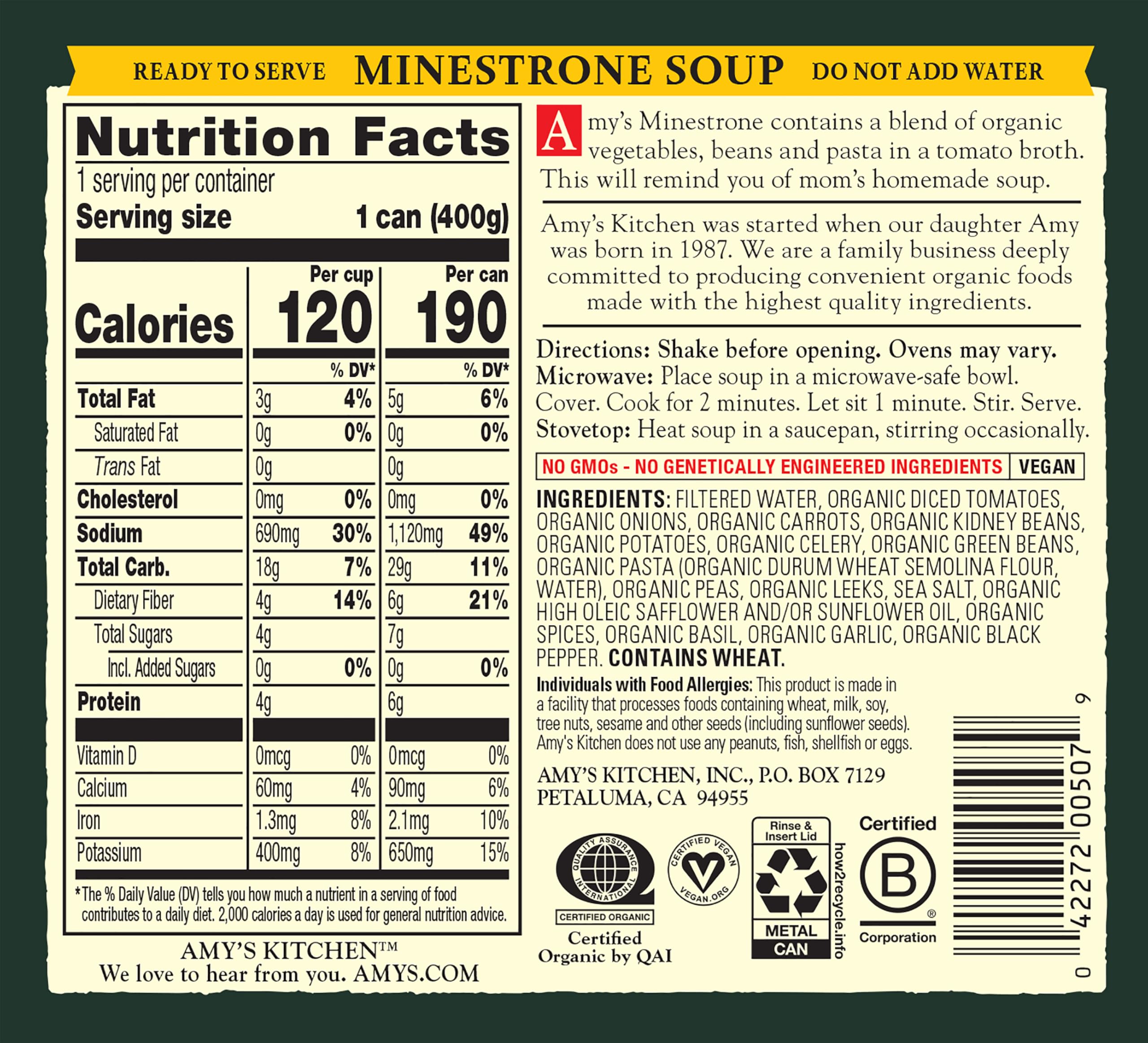 Amy's Organic Minestrone Soup is a low fat (5 grams per can) Italian favorite made from scratch with a rich tomato broth, savory organic vegetables, tender beans and pasta. Convenient and easy to prepare, this soup contains wheat, and is dairy free, lactose free, and soy, corn and tree nut free. It is also suitable for vegan and kosher diets. Try our Light in Sodium option, as well! Since 1987, we at Amy’s Kitchen have produced delicious, convenient foods for people who are sometimes too busy to cook. Amy’s is a family-run business, and we supervise every aspect of our business and take pride in customer satisfaction. All the fruits, vegetables and grains we use are grown without the use of insecticides, GMOs and other harmful chemicals. We prepare these ingredients with the same careful attention in our kitchen as you would in your own home for high-quality, home-style vegetarian and vegan meals. No meat, fish, shellfish, poultry, eggs or peanuts are ever used in any Amy's products. Even though you're heating up our meals in your home, we want each bite to taste like you're a guest in ours.
