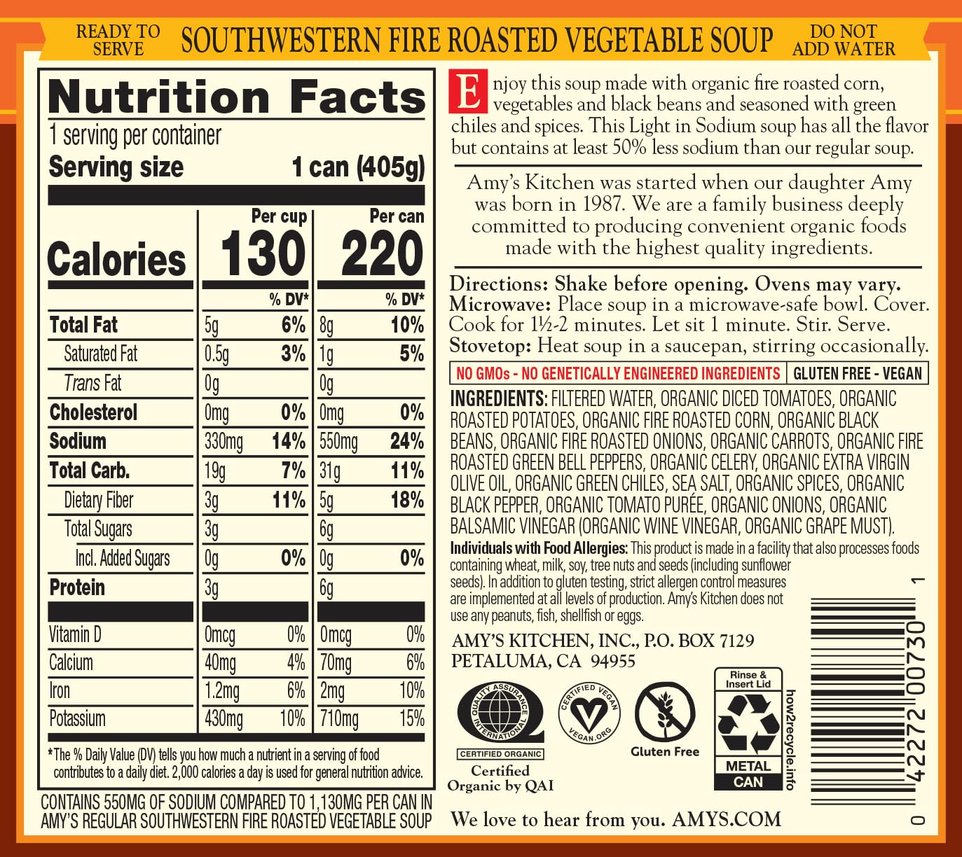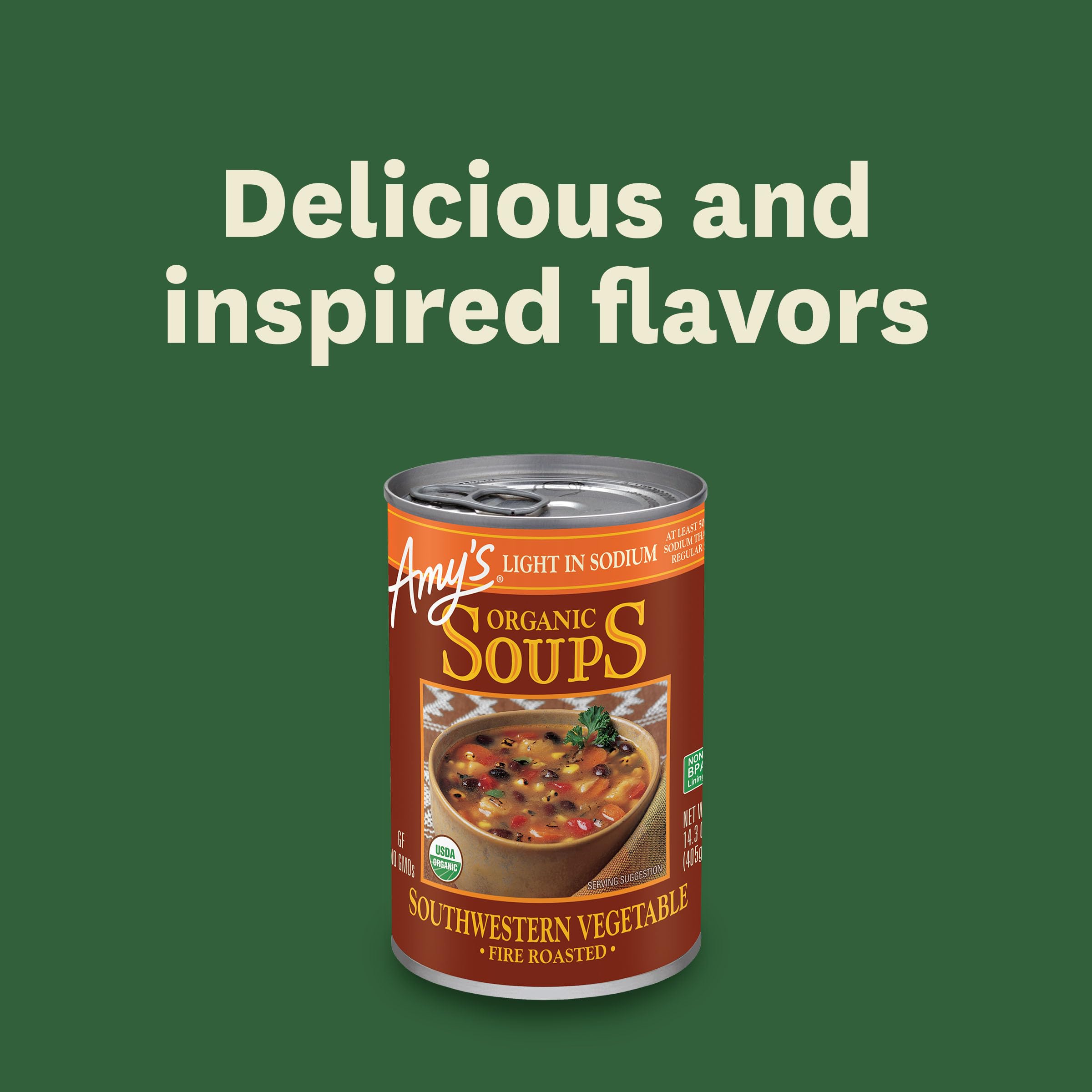 Amy's Soup, Organic Fire Roasted Vegetable with Black Beans, Light in Sodium, Vegan & Gluten Free, 14.3 oz