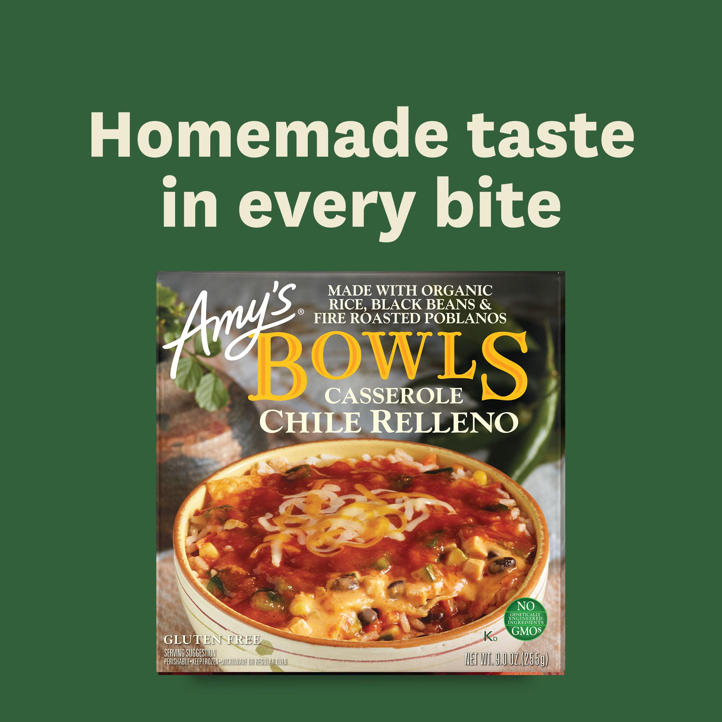 Amy's Chile Relleno Casserole is made with organic zucchini, corn, rice, black beans and chopped, fire-roasted poblanos. It is then generously topped with super savory cheeses for the perfect mix of spice and comfort the whole family can enjoy. Convenient and easy to prepare, this Amy's Chile Relleno Casserole Bowl contains milk and soy, is non GMO, and is gluten free and tree nut free. It is also suitable for kosher diets. At Amy’s Kitchen goodness is our guiding principle. Since 1987, we at Amy’s Kitchen produce delicious, organic convenient foods for people who are sometimes too busy to cook. Amy’s is a family-run business, and we supervise every aspect of our business and take pride in customer satisfaction. All the fruits, vegetables and grains we use are grown without the use of insecticides, GMOs and other harmful chemicals. We prepare these ingredients with the same careful attention in our kitchen as you would in your own home for high-quality, home-style vegetarian and vegan meals. No meat, fish, shellfish, poultry, eggs or peanuts are ever used in any Amy's products. Even though you're heating up our meals in your home, we want each bite to taste like you're a guest in ours.