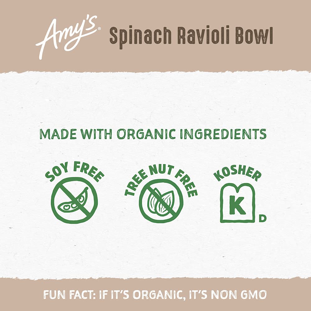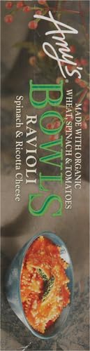 Amy's Spinach and Ricotta Cheese Ravioli Bowl is made with organic spinach, tomatoes, onions and creamy cheese inside tender pasta, all covered with our home-style tomato sauce and sprinkled with Parmesan cheese. Now that's spinach the whole family can enjoy! Convenient and easy to prepare, this bowl contains wheat and milk, is non GMO, soy free and tree nut free. It is also suitable for kosher diets. At Amy’s Kitchen goodness is our guiding principle. Since 1987, we at Amy’s Kitchen produce delicious, organic convenient foods for people who are sometimes too busy to cook. Amy’s is a family-run business, and we supervise every aspect of our business and take pride in customer satisfaction. All the fruits, vegetables and grains we use are grown without the use of insecticides, GMOs and other harmful chemicals. We prepare these ingredients with the same careful attention in our kitchen as you would in your own home for high-quality, home-style vegetarian and vegan meals. No meat, fish, shellfish, poultry, eggs or peanuts are ever used in any Amy's products. Even though you're heating up our meals in your home, we want each bite to taste like you're a guest in ours.