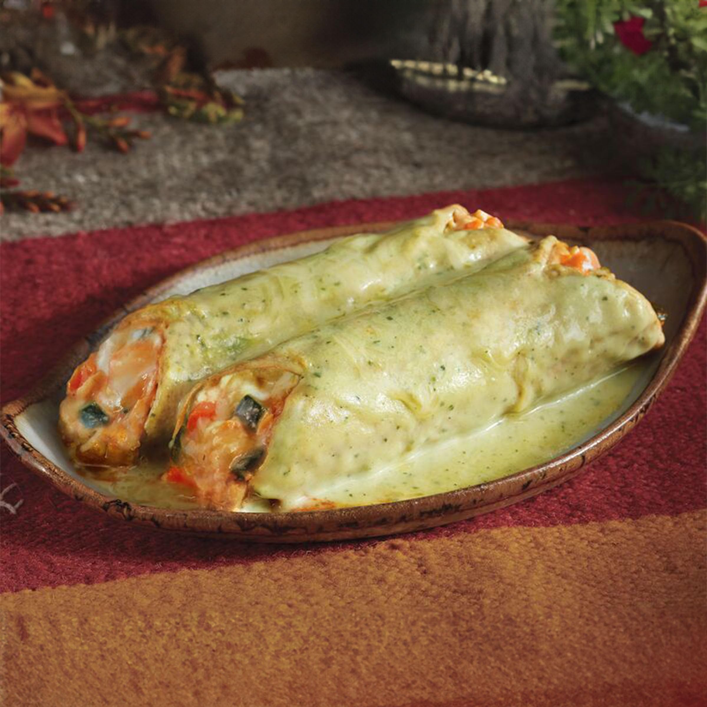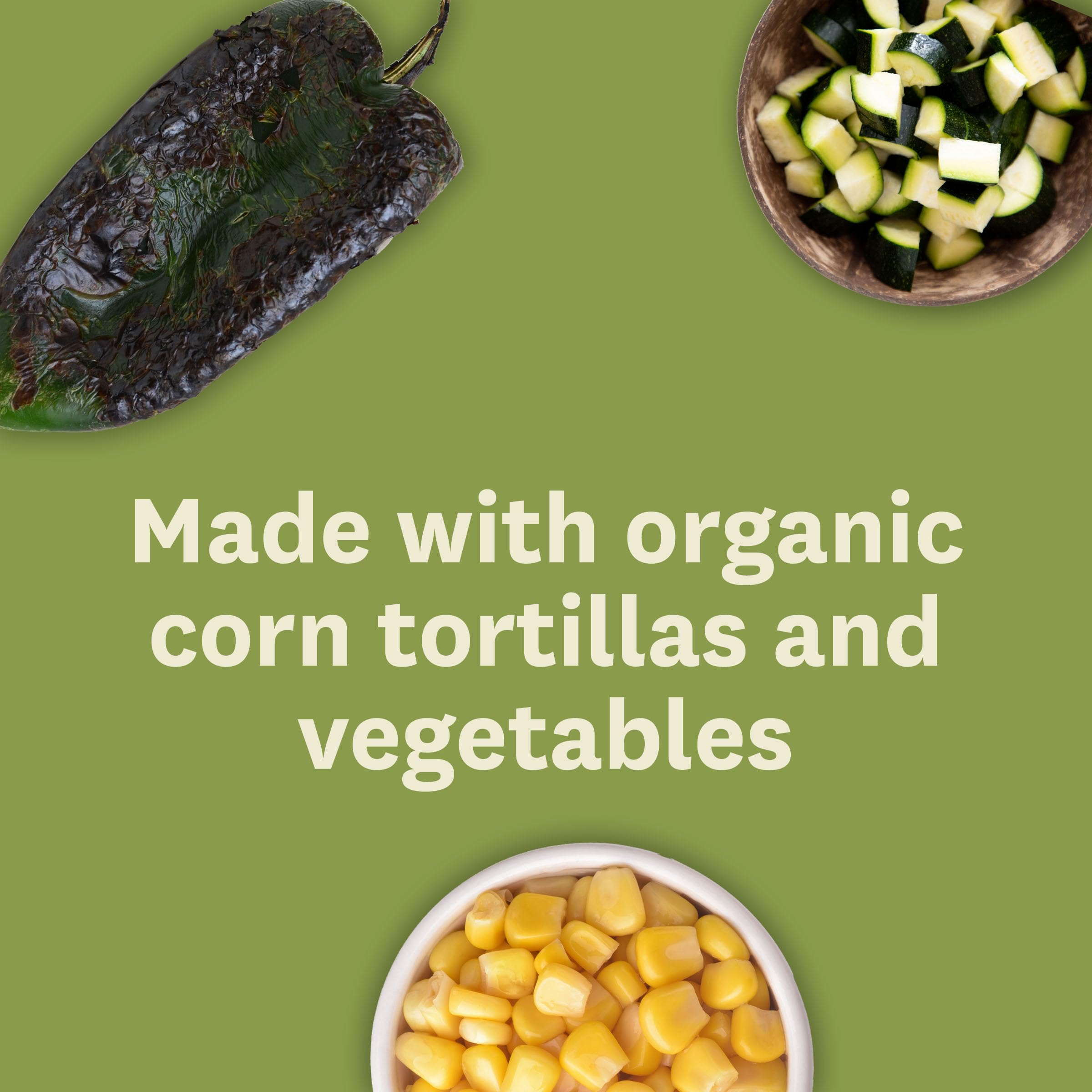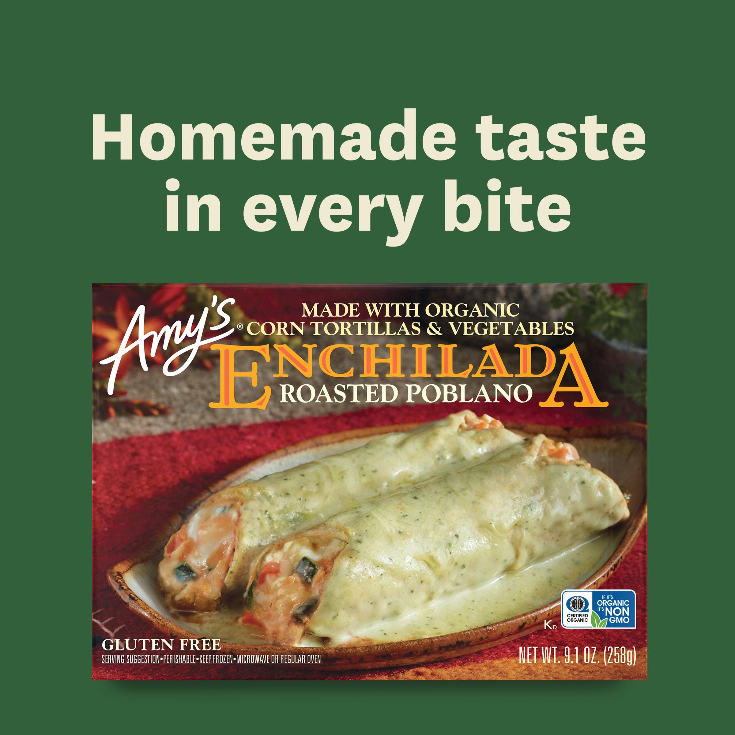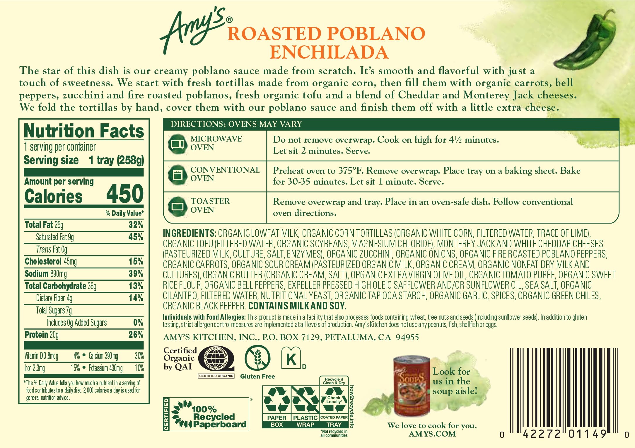 We fill organic corn tortillas with carrots, bell peppers, zucchini and fire roasted poblanos, plus organic house-made tofu and a blend of Cheddar and Monterey Jack cheeses. Then we fold the tortillas by hand, cover them with our smooth, creamy poblano sauce and finish with a little extra cheese. As if you didn’t already love Mexican food enough. Gluten free, tree nut free, non-GMO and kosher. Since 1987, we at Amy’s Kitchen have produced delicious, convenient foods for people who are sometimes too busy to cook. Amy’s is a family-run business, and we supervise every aspect of our business and take pride in customer satisfaction. All the fruits, vegetables and grains we use are grown without the use of insecticides, GMOs and other harmful chemicals. We prepare these ingredients with the same careful attention in our kitchen as you would in your own home for high-quality, home-style vegetarian and vegan meals. No meat, fish, shellfish, poultry, eggs or peanuts are ever used in any Amy's products. Even though you're heating up our meals in your home, we want each bite to taste like you're a guest in ours.