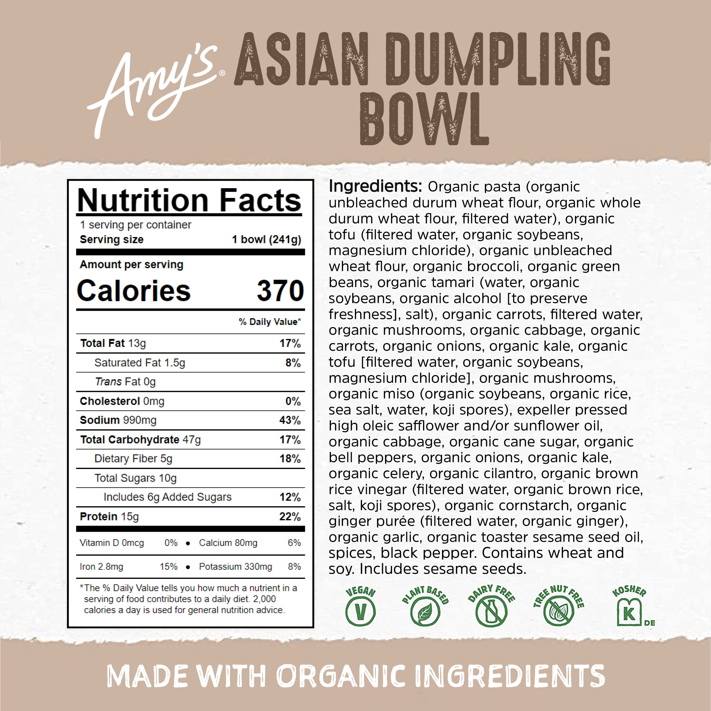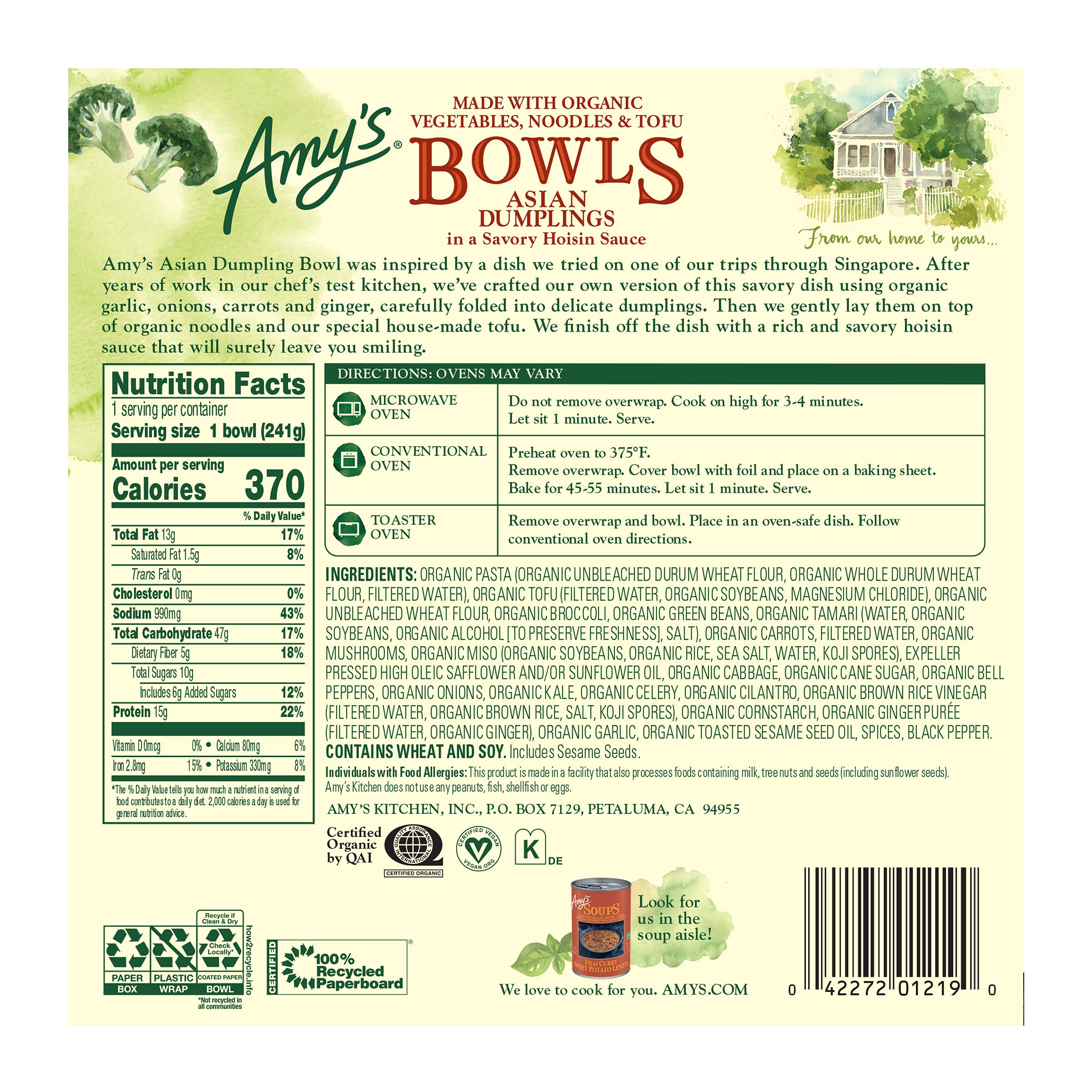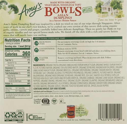 Amy's Frozen Bowls, Asian Dumplings In a Savory Hoisin Sauce, Vegan, 8.5 oz.