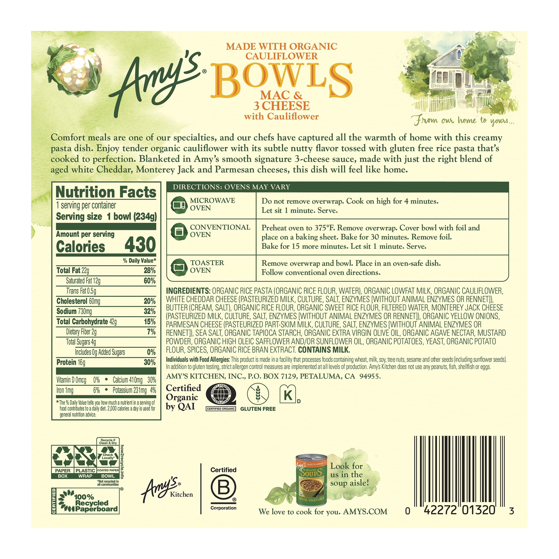 Enjoy tender organic cauliflower with its subtle nutty flavor tossed with gluten free rice pasta that's cooked to perfection. Blanketed in Amy's Smooth, signature 3 Cheese sauce, made with just the right blend of aged white cheddar, Monterey Jack and Parmesan cheeses, this dish will feel like home. Gluten free/tree nut free/Soy free/corn Free/kosher