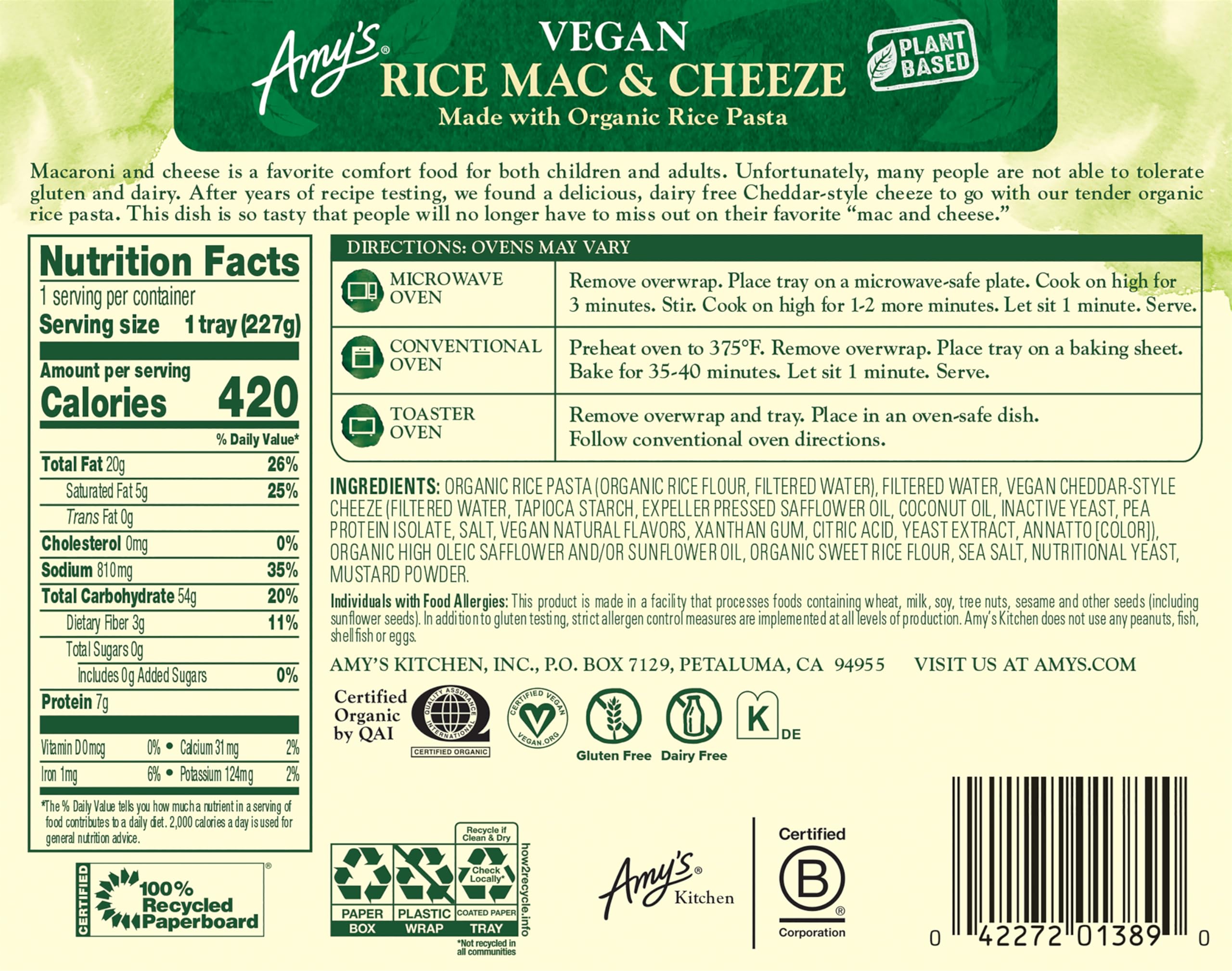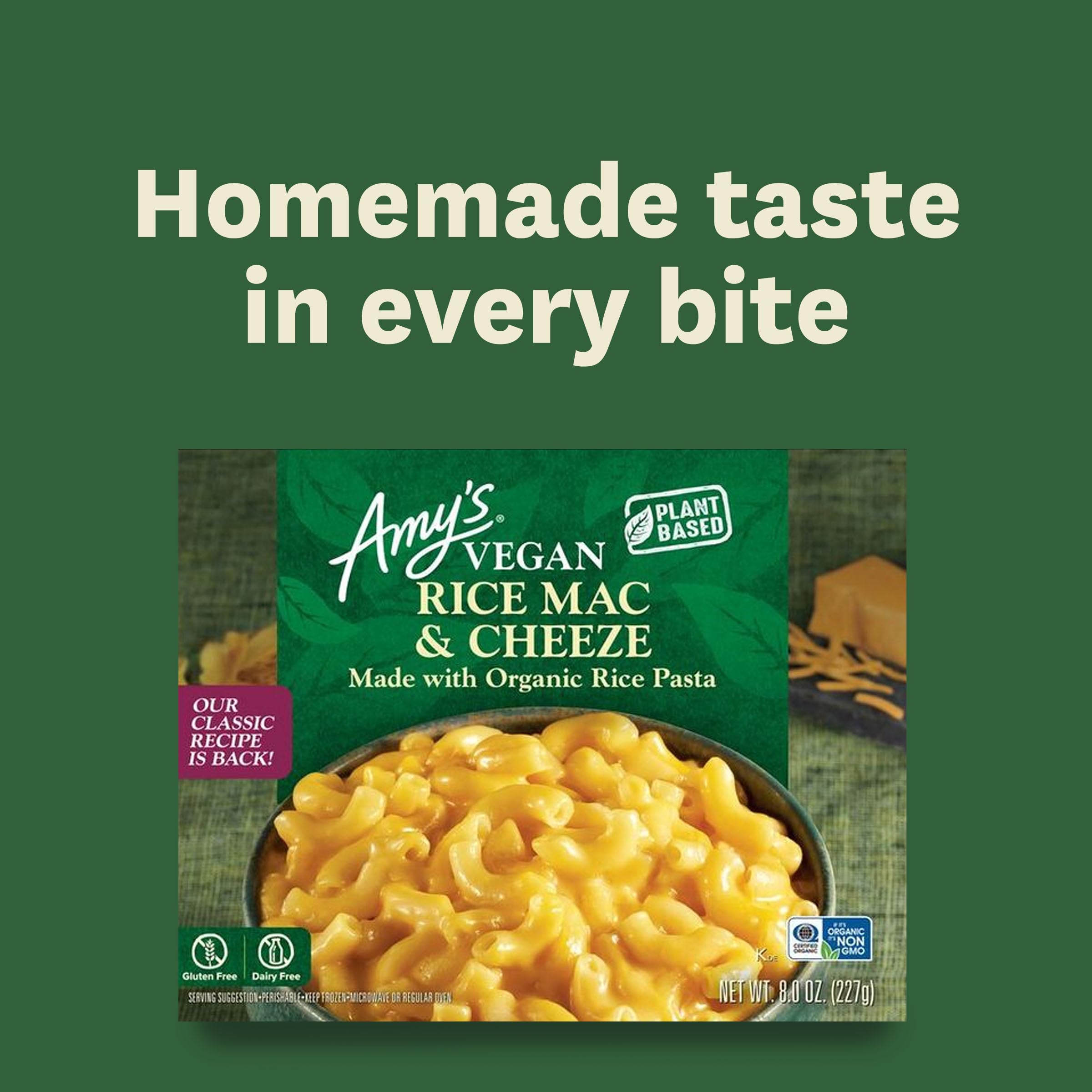Years of recipe testing led to this worth-the-wait version of our creamy original. Dairy free cheeze, tender organic rice pasta and a rich, smooth sauce come together in one truly tasty dish. Gluten free/dairy free/lactose free/vegan/soy free/kosher/plant based