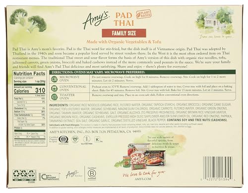 Family size of Amy's Pad Thai Noodles the whole family will love! Made with organic broad rice noodles, organic house-made tofu, organic julienned carrots, green onions and broccoli, this traditional dish is delicious, gluten free and dairy free. We’ve also added our own twist: Baked cashews instead of the typical peanuts. This is a great-tasting way to try Thai! It’s also convenient and easy to prepare, simply heat and serve. Since 1987, we at Amy’s Kitchen have produced delicious, convenient foods for people who are sometimes too busy to cook. Amy’s is a family-run business, and we supervise every aspect of our business and take pride in customer satisfaction. All the fruits, vegetables and grains we use are grown without the use of insecticides, GMOs and other harmful chemicals. We prepare these ingredients with the same careful attention in our kitchen as you would in your own home for high-quality, home-style vegetarian and vegan meals. No meat, fish, shellfish, poultry, eggs or peanuts are ever used in any Amy's products. Even though you're heating up our meals in your home, we want each bite to taste like you're a guest in ours.